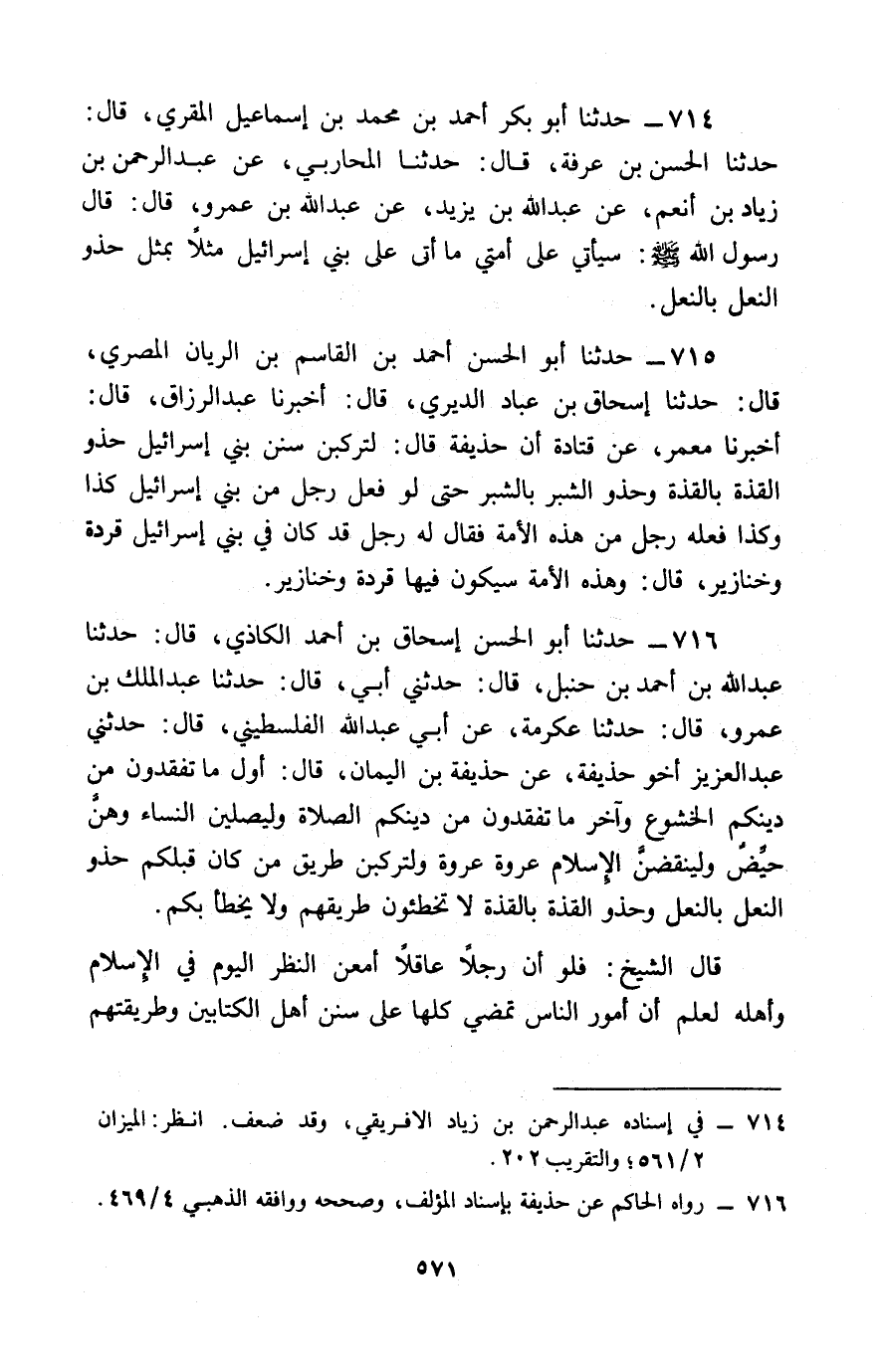 716 - حَدَّثَنَا أَبُو الْحَسَنِ إِسْحَاقُ بْنُ أَحْمَدَ الْكَاذِيُّ قَالَ: حَدَّثَنَا عَبْدُ اللَّهِ بْنُ أَحْمَدَ بْنِ حَنْبَلٍ , قَالَ: حَدَّثَنِي أَبِي قَالَ: حَدَّثَنَا عَبْدُ الْمَلِكِ بْنُ عَمْرٍو , قَالَ: حَدَّثَنَا عِكْرِمَةُ , عَنْ أَبِي عَبْدِ اللَّهِ الْفِلَسْطِينِيِّ , قَالَ: حَدَّثَنِي عَبْدُ الْعَزِيزِ , أَخُو حُذَيْفَةَ , عَنْ حُذَيْفَةَ بْنِ الْيَمَانِ , قَالَ: § «أَوَّلُ مَا تَفْقِدُونَ مِنْ دِينِكُمُ الْخُشُوعُ , وَآخِرُ مَا تَفْقِدُونَ مِنْ دِينِكُمُ الصَّلَاةُ , وَلَيُصَلِّيَنَّ النِّسَاءُ وَهُنَّ حُيَّضٌ , وَلَيُنْقَضَنَّ الْإِسْلَامُ عُرْوَةً عُرْوَةً , وَلَتَرْكَبُنَّ طَرِيقَ مَنْ كَانَ قَبْلَكُمْ حَذْوَ النَّعْلِ بِالنَّعْلِ , وَحَذْوَ الْقُذَّةِ بِالْقُذَّةِ , لَا تُخْطِئُونَ طَرِيقَهُمْ , وَلَا يَخْطَأُ بِكُمْ» قَالَ الشَّيْخُ: فَلَوْ أَنَّ رَجُلًا عَاقِلًا أَمْعَنَ النَّظَرَ الْيَوْمَ فِي الْإِسْلَامِ وَأَهْلِهِ لَعَلِمَ أَنَّ أُمُورَ النَّاسِ تَمْضِي كُلُّهَا عَلَى سُنَنِ أَهْلِ الْكِتَابَيْنِ وَطَرِيقَتِهِمْ -[572]- وَعَلَى سُنَّةِ كِسْرَى وَقَيْصَرَ , وَعَلَى مَا كَانَتْ عَلَيْهِ الْجَاهِلِيَّةِ , فَمَا طَبَقَةٌ مِنَ النَّاسِ وَمَا صِنْفٌ مِنْهُمْ إِلَّا وَهُمْ فِي سَائِرِ أُمُورِهِمْ مُخَالِفُونَ لِشَرَائِعِ الْإِسْلَامِ , وَسُنَّةِ الرَّسُولِ صَلَّى اللَّهُ عَلَيْهِ وَسَلَّمَ مُضَاهُونَ فِيمَا يَفْعَلُ أَهْلُ الْكِتَابَيْنِ وَالْجَاهِلِيَّةِ قَبْلَهُمْ , فَإِنْ صَرَفَ بَصَرَهُ إِلَى السَّلْطَنَةِ وَأَهْلِهَا وَحَاشِيَتِهَا , وَمَنْ لَاذَ بِهَا مِنْ حُكَّامِهِمْ وَعُمَّالِهِمْ وَجَدَ الْأَمْرَ كُلَّهُ فِيهِمْ بِالضِّدِّ مِمَّا أُمِرُوا بِهِ , وَنُصِّبُوا لَهُ فِي أَفْعَالِهِمْ وَأَحْكَامِهِمْ وَزِيِّهِمْ , وَلِبَاسِهِمْ , وَكَذَلِكَ فِي سَائِرِ النَّاسِ بَعْدَهُمْ مِنَ التُّجَّارِ وَالسُّوقَةِ , وَأَبْنَاءِ الدُّنْيَا وَطَالِبِيهَا مِنَ الزُّرَّاعِ وَالصُّنَّاعِ وَالْأُجَرَاءِ وَالْفُقَرَاءِ وَالْقُرَّاءِ وَالْعُلَمَاءِ إِلَّا مَنْ عَصَمَهُ اللَّهُ. وَمَتَى فَكَّرْتَ فِي ذَلِكَ وَجَدْتَ الْأَمْرَ كَمَا أَخْبَرْتُكَ فِي الْمَصَائِبِ وَالْأَفْرَاحِ وَفِي الزِّيِّ وَاللِّبَاسِ وَالْآنِيَةِ وَالْأَبْنِيَةِ وَالْمَسَاكِنِ وَالْخُدَّامِ وَالْمَرَاكِبِ وَالْوَلَائِمِ وَالْأَعْرَاسِ وَالْمَجَالِسِ وَالْفُرُشِ وَالْمَآكِلِ وَالْمَشَارِبِ , وَكُلِّ ذَلِكَ فَيَجْرِي خِلَافَ الْكِتَابِ وَالسُّنَّةِ بِالضِّدِّ مِمَّا أُمِرَ بِهِ الْمُسْلِمُونَ , وَنُدِبَ إِلَيْهِ الْمُؤْمِنُونَ , وَكَذَلِكَ مَنْ بَاعَ وَاشْتَرَى وَمَلَكَ وَاقْتَنَى وَاسْتَأْجَرَ وَزَرَعَ وَزَارَعَ , فَمَنْ طَلَبَ السَّلَامَةَ لِدِينِهِ فِي وَقْتِنَا هَذَا مَعَ النَّاسِ عُدِمَهَا , وَمَنْ أَحَبَّ أَنْ يَلْتَمِسَ مَعِيشَةً عَلَى حُكْمِ الْكِتَابِ وَالسُّنَّةِ فَقْدَهَا , وَكَثُرَ خُصَمَاؤُهُ وَأَعْدَاؤُهُ وَمُخَالِفُوهُ وَمُبْغِضُوهُ فِيهَا , فَاللَّهُ الْمُسْتَعَانُ فَمَا أَشَدَّ تَعَذُّرَ السَّلَامَةِ فِي الدِّينِ فِي هَذَا الزَّمَانِ , فَطُرُقَاتِ الْحَقِّ خَالِيَةٌ مِقْفِرَةٌ مُوحِشَةٌ قَدْ عُدِمَ سَالِكُوهَا وَانْدَفَنَتْ مَحَاجُّهَا , وَتَهَدَّمَتْ صَوَايَاهَا وَأَعْلَامُهَا , وَفُقِدَ أَدْلَاؤُهَا وَهُدَاتُهَا , قَدْ وَقَفَتْ شَيَاطِينُ الْإِنْسِ وَالْجِنِّ عَلَى فِجَاجِهَا وَسُبُلِهَا تُتَخَطَّفُ النَّاسُ عَنْهَا , فَاللَّهُ الْمُسْتَعَانُ , فَلَيْسَ يَعْرِفُ هَذَا الْأَمْرَ وَيُهِمُّهُ إِلَّا رَجُلٌ عَاقِلٌ مُمَيِّزٌ , قَدْ أَدَّبَهُ الْعِلْمُ وَشَرَحَ اللَّهُ صَدْرَهُ بِالْإِيمَانِ