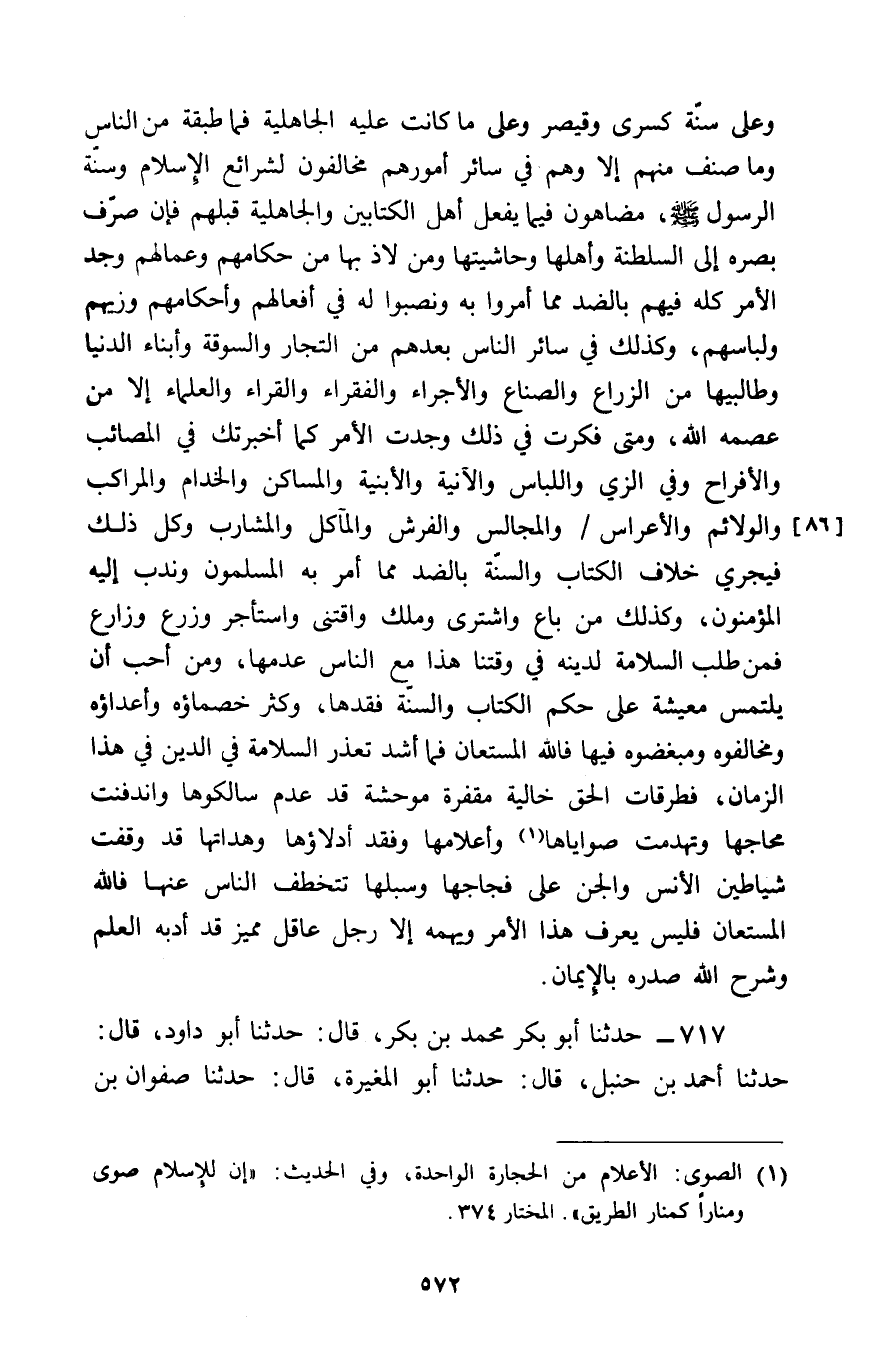 717 - حَدَّثَنَا أَبُو بَكْرٍ مُحَمَّدُ بْنُ بَكْرٍ قَالَ: حَدَّثَنَا أَبُو دَاوُدَ , قَالَ: حَدَّثَنَا أَحْمَدُ بْنُ حَنْبَلٍ , قَالَ: حَدَّثَنَا أَبُو الْمُغِيرَةِ , قَالَ: حَدَّثَنَا صَفْوَانُ بْنُ -[573]- عَمْرٍو , قَالَ: حَدَّثَنِي يَزِيدُ بْنُ خُمَيْرٍ الرَّحْبِيُّ , قَالَ: سَأَلْتُ عَبْدَ اللَّهِ بْنَ بُسْرٍ صَاحِبَ النَّبِيِّ صَلَّى اللَّهُ عَلَيْهِ وَسَلَّمَ: كَيْفَ حَالُنَا مِنْ حَالِ مَنْ كَانَ قَبْلَنَا قَالَ: سُبْحَانَ اللَّهِ § «لَوْ نُشَرُوا مِنَ الْقُبُورِ مَا عَرَفُوكُمْ إِلَّا أَنْ يَجِدُوكُمْ قِيَامًا تُصَلُّونَ»