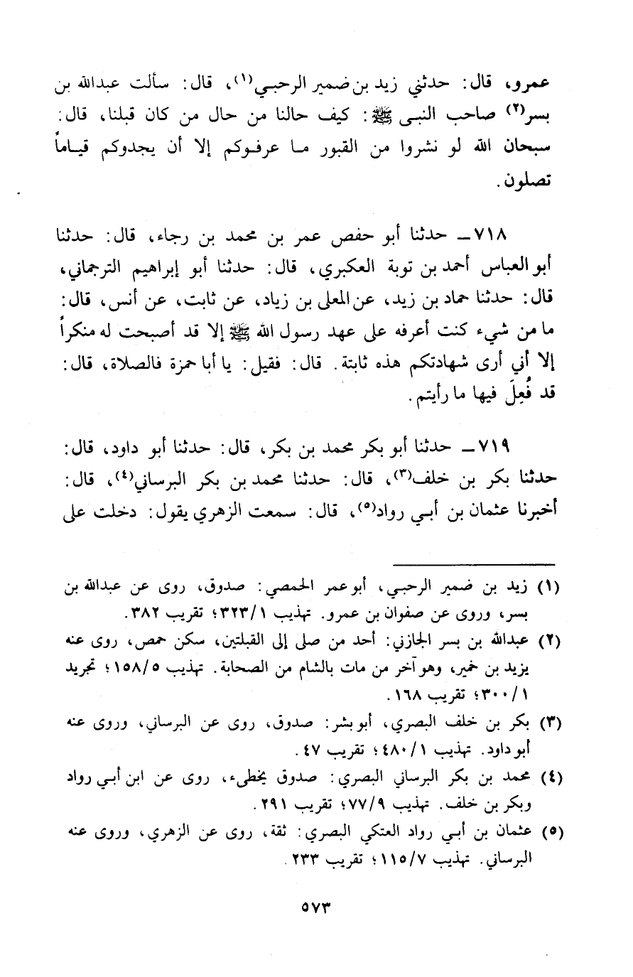 719 - حَدَّثَنَا أَبُو بَكْرٍ مُحَمَّدُ بْنُ بَكْرٍ قَالَ: حَدَّثَنَا أَبُو دَاوُدَ , قَالَ: حَدَّثَنَا بَكْرُ بْنُ خَلَفٍ , قَالَ: حَدَّثَنَا مُحَمَّدُ بْنُ بَكْرٍ الْبُرْسَانِيُّ , قَالَ: أَخْبَرَنَا عُثْمَانُ بْنُ أَبِي رَوَّادٍ , قَالَ: سَمِعْتُ الزُّهْرِيَّ , يَقُولُ: دَخَلْتُ عَلَى -[574]- أَنَسِ بْنِ مَالِكٍ بِدِمَشْقَ وَهُوَ يَبْكِي , قُلْتُ: وَمَا يُبْكِيكَ؟ قَالَ: § «مَا أَعْرِفُ شَيْئًا مِمَّا كُنَّا عَلَيْهِ , إِلَّا هَذِهِ الصَّلَاةَ , وَقَدْ ضُيِّعَتْ»