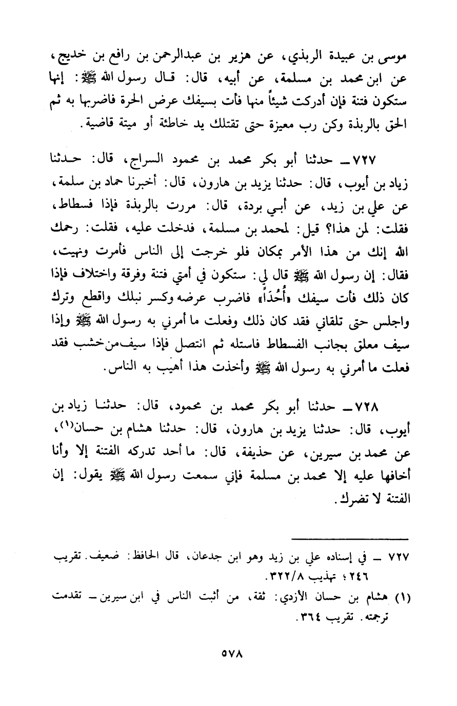 727 - حَدَّثَنَا أَبُو بَكْرٍ مُحَمَّدُ بْنُ مَحْمُودٍ السَّرَّاجُ قَالَ: حَدَّثَنَا زِيَادُ بْنُ أَيُّوبَ , قَالَ: حَدَّثَنَا يَزِيدُ بْنُ هَارُونَ , قَالَ: أَخْبَرَنَا حَمَّادُ بْنُ سَلَمَةَ , عَنْ عَلِيِّ بْنِ زَيْدٍ , عَنْ أَبِي بُرْدَةَ , قَالَ: مَرَرْتُ بِالرَّبَذَةِ فَإِذَا فُسْطَاطٌ فَقُلْتُ: لِمَنْ هَذَا؟ قِيلَ: لِمُحَمَّدِ بْنِ مَسْلَمَةَ , فَدَخَلْتُ عَلَيْهِ , فَقُلْتُ: رَحِمَكَ اللَّهُ إِنَّكَ مِنْ هَذَا الْأَمْرِ بِمَكَانٍ , فَلَوْ خَرَجْتَ إِلَى النَّاسِ فَأَمَرْتَ وَنَهَيْتَ , فَقَالَ: إِنَّ رَسُولَ اللَّهِ صَلَّى اللَّهُ عَلَيْهِ وَسَلَّمَ قَالَ لِي: § «سَتَكُونُ فِي أُمَّتِي فِتْنَةٌ وَفُرْقَةٌ وَاخْتِلَافٌ , فَإِذَا كَانَ ذَلِكَ , فَأْتِ سَيْفَكَ أُحُدًا , فَاضْرِبْ عُرْضَهُ , وَكَسِّرْ نَبْلَكَ , وَاقْطَعْ وَتَرَكَ , وَاجْلِسْ حَتَّى تَلْقَانِي , فَقَدْ كَانَ ذَلِكَ , وَفَعَلْتُ مَا أَمَرَنِي بِهِ رَسُولُ اللَّهِ صَلَّى اللَّهُ عَلَيْهِ وَسَلَّمَ , وَإِذَا سَيْفٌ مُعَلَّقٌ بِجَانِبِ الْفُسْطَاطِ , فَاسْتَلَّهُ ثُمَّ انْتَصَلَ , فَإِذَا سَيْفٌ مِنْ خَشَبٍ , فَقَدْ فَعَلْتُ مَا أَمَرَنِي بِهِ رَسُولُ اللَّهِ صَلَّى اللَّهُ عَلَيْهِ وَسَلَّمَ , وَأَخَذْتُ هَذَا أُهِيبُ بِهِ النَّاسَ»