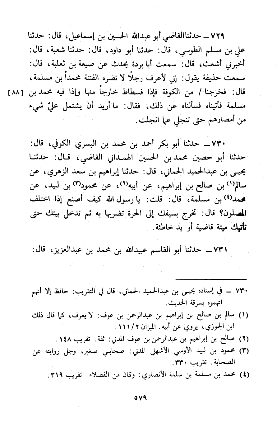 730 - حَدَّثَنَا أَبُو بَكْرٍ أَحْمَدُ بْنُ مُحَمَّدِ بْنِ السَّرِيِّ الْكُوفِيُّ قَالَ: حَدَّثَنَا أَبُو حَصِينٍ مُحَمَّدُ بْنُ الْحُسَيْنِ الْهَمْدَانِيُّ الْقَاضِي قَالَ: حَدَّثَنَا يَحْيَى بْنُ عَبْدِ الْحَمِيدِ الْحِمَّانِيُّ , قَالَ: حَدَّثَنَا إِبْرَاهِيمُ بْنُ سَعْدٍ الزُّهْرِيُّ , عَنْ سَالِمِ بْنِ صَالِحِ بْنِ إِبْرَاهِيمَ , عَنْ أَبِيهِ , عَنْ مَحْمُودِ بْنِ لَبِيدٍ , عَنْ مُحَمَّدِ بْنِ مَسْلَمَةَ , قَالَ: قُلْتُ: يَا رَسُولَ اللَّهِ كَيْفَ أَصْنَعُ إِذَا اخْتَلَفَ الْمُصَلُّونَ؟ قَالَ: § «تَخْرُجُ بِسَيْفِكَ إِلَى الْحَرَّةِ تَضْرِبُهَا بِهِ , ثُمَّ تَدْخُلُ بَيْتَكَ , حَتَّى تَأْتِيَكَ مِيتَةٌ قَاضِيَةٌ , أَوْ يَدٌ خَاطِئَةٌ»