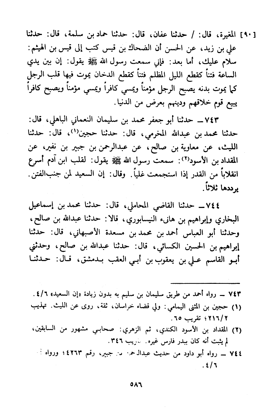 743 - حَدَّثَنَا أَبُو جَعْفَرٍ مُحَمَّدُ بْنُ سُلَيْمَانَ النُّعْمَانِيُّ الْبَاهِلِيُّ قَالَ: حَدَّثَنَا مُحَمَّدُ بْنُ عَبْدِ اللَّهِ الْمُخَرِّمِيُّ , قَالَ: حَدَّثَنَا حُجَيْنٌ , قَالَ: حَدَّثَنَا اللَّيْثُ , عَنْ مُعَاوِيَةَ بْنِ صَالِحٍ , عَنْ عَبْدِ الرَّحْمَنِ بْنِ جُبَيْرِ بْنِ نُفَيْرٍ , عَنِ الْمِقْدَادِ بْنِ الْأَسْوَدِ: سَمِعْتُ رَسُولَ اللَّهِ صَلَّى اللَّهُ عَلَيْهِ وَسَلَّمَ يَقُولُ: § «لَقَلْبُ ابْنِ آدَمَ أَسْرَعُ انْقِلَابًا مِنَ الْقِدْرِ , إِذَا اسْتَجْمَعَتْ غَلْيًا» , وَقَالَ: «إِنَّ السَّعِيدَ لَمَنْ جُنِّبَ الْفِتَنَ» , يُرَدِّدُهَا ثَلَاثًا "