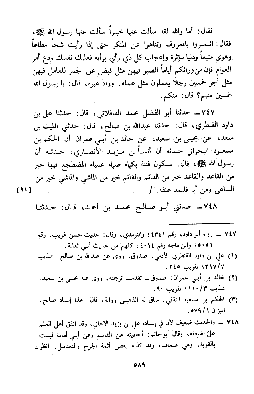 747 - حَدَّثَنَا أَبُو الْفَضْلِ مُحَمَّدٌ الْقَافْلَائِيُّ قَالَ: حَدَّثَنَا عَلِيُّ بْنُ دَاوُدَ الْقَنْطَرِيُّ , قَالَ: حَدَّثَنَا عَبْدُ اللَّهِ بْنُ صَالِحٍ , قَالَ: حَدَّثَنِي اللَّيْثُ بْنُ سَعْدٍ , عَنْ يَحْيَى بْنِ سَعِيدٍ , عَنْ خَالِدِ بْنِ أَبِي عِمْرَانَ , أَنَّ الْحَكَمَ بْنَ مَسْعُودٍ النَّجْرَانِيَّ , حَدَّثَهُ أَنَّ أَنَسَ بْنَ مَزْيَدٍ الْأَنْصَارِيَّ حَدَّثَهُ أَنَّ رَسُولَ اللَّهِ صَلَّى اللَّهُ عَلَيْهِ وَسَلَّمَ قَالَ: § «سَتَكُونُ فِتْنَةٌ بَكْمَاءُ صَمَّاءُ عَمْيَاءُ , الْمُضْطَجِعُ فِيهَا خَيْرٌ مِنَ الْقَاعِدِ , وَالْقَاعِدُ خَيْرٌ مِنَ الْقَائِمِ , وَالْقَائِمُ خَيْرٌ مِنَ الْمَاشِي , وَالْمَاشِي خَيْرٌ مِنَ السَّاعِي , وَمَنْ أَبَى فَلْيَمُدَّ عُنُقَهُ»