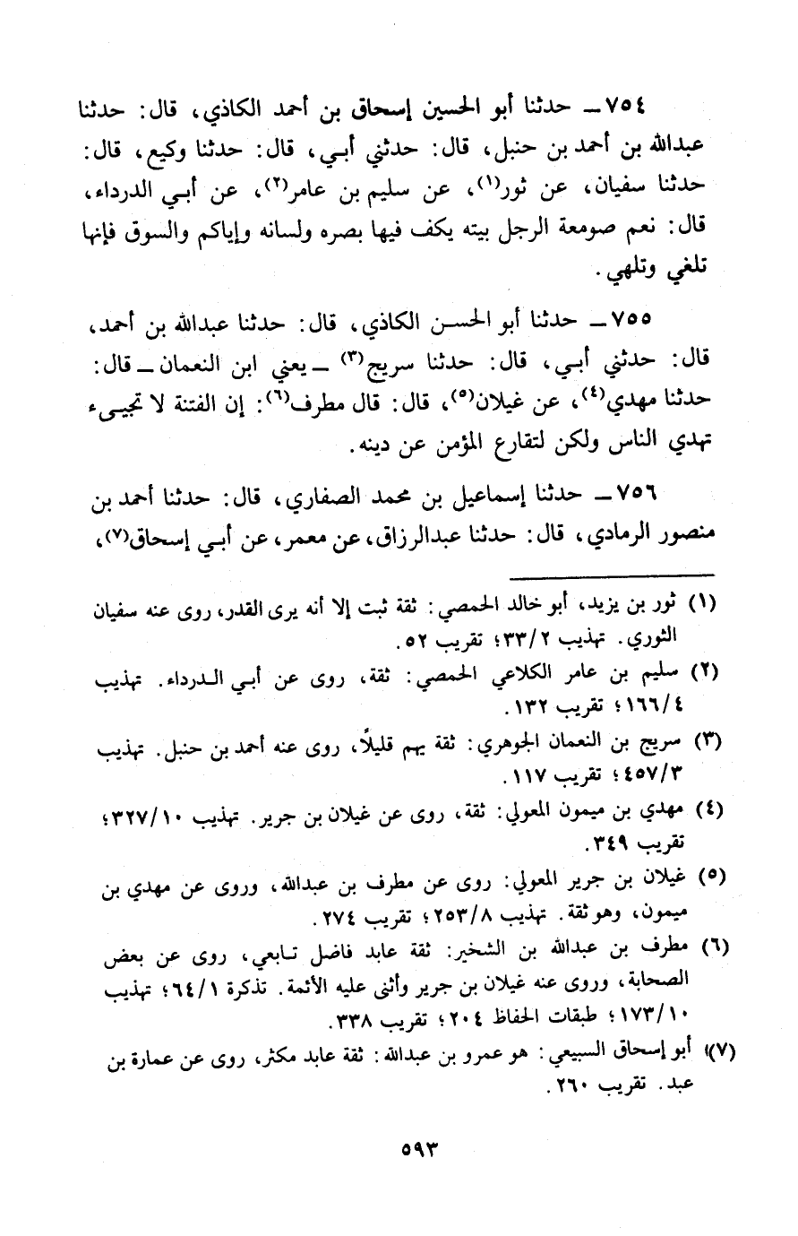 754 - حَدَّثَنَا أَبُو الْحُسَيْنِ إِسْحَاقُ بْنُ أَحْمَدَ الْكَاذِيُّ قَالَ: حَدَّثَنَا عَبْدُ اللَّهِ بْنُ أَحْمَدَ بْنِ حَنْبَلٍ , قَالَ: حَدَّثَنِي أَبِي قَالَ: حَدَّثَنَا وَكِيعٌ , قَالَ: حَدَّثَنَا سُفْيَانُ , عَنْ ثَوْرٍ , عَنْ سُلَيْمِ بْنِ عَامِرٍ , عَنْ أَبِي الدَّرْدَاءِ , قَالَ: § «نِعْمَ صَوْمَعَةُ الرَّجُلِ بَيْتُهُ , يَكُفُّ فِيهَا بَصَرَهُ وَلِسَانَهُ , وَإِيَّاكُمْ وَالسُّوقَ , فَإِنَّهَا تُلْغِي وَتُلْهِي»
