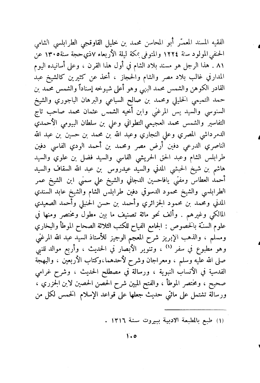الفقيه المسند المعمر أبو المحاسن محمد بن خليل القاوقجي الطرابلسي الشامي الحنفي المولود سنة 1224 والمتوفى بمكة ليلة الأربعاء 7 ذي حجة سنة 1305 عن 81. هذا الرجل هو مسند بلاد الشام في أول هذا القرن، وعلى أسانيده اليوم المدار في غالب بلاد مصر والشام والحجاز، أخذ عن كثيرين كالشيخ عبد القادر الكوهن والشمس محمد البهي وهو أعلى شيوخه إسناداً والشمس محمد بن حمد التميمي الخليلي ومحمد بن صالح السباعي والبرهان الباجوري والشيخ السنوسي والسيد يس المرغني وابن أخيه الشمس عثمان محمد صاحب تاج التفاسير والشمس محمد العجيمي التطواني وعلي بن سلطان البيومي الأحمدي الدمرداشي المصري وعلي النجاري وعبد الله بن محمد بن حسين بن عبد الله الناصري الدرعي دفين أرض مصر ومحمد بن أحمد الودي الفاسي دفين طرابلس الشام وعبد الحق الحريشي الفاسي والسيد فضل بن علوي والسيد هاشم بن شيخ الحبشي المدني والسيد عيدروس بن عبد الله السقاف والسيد أحمد العطاس ومفتي يافا حسين الدجاني والشيخ عليّ سمني ابن الشيخ عمر الطرابلسي والشيخ محمود الدسوقي دفين طرابلس الشام والشيخ عابد السندي المدني ومحمد بن محمود الجزائري وأحمد بن حسن الحنبلي وأحمد الصعيدي المالكي وغيرهم. وألف نحو مائة تصنيف مابين مطول ومختصر ومنها في علوم السنة بالخصوص: الجامع الفياح للكتب الثلاثة الصحاح الموطأ والبخاري ومسلم، والذهب الإبريز شرح المعجم الوجيز للأستاذ السيد عبد الله المرغني وهو مطبوع في سفر (1) ، وتنوير الأبصار في الحديث، وأربع موالد للنبي صلى الله عليه وسلم، ومعراجان وشرح لأحدهما، وكتاب الأربعين، والبهجة القدسية في الأنساب النبوية، ورسالة في مصطلح الحديث، وشرح غرامي صحيح، ومختصر الموطأ، والفتح المبين شرح الحصن الحصين لابن الجزري، ورسالة تشتمل على مائتي حديث جعلها على قواعد الإسلام الخمس لكل من