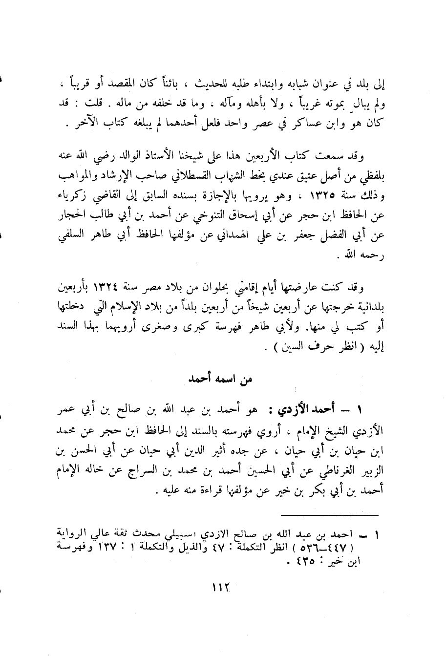 1 - أحمد الأزدي (1) : هو أحمد بن عبد الله بن صالح بن أبي عمر الأزدي الشيخ الإمام، أروي فهرسته بالسند إلى الحافظ ابن حجر عن محمد ابن حيان بن أبي حيان، عن جده أثير الدين أبي حيان عن أبي الحسن بن الزبير الغرناطي عن أبي الحسين أحمد بن محمد بن السراج عن خاله الإمام أحمد بن أبي بكر بن خير عن مؤلفها قراءة منه عليه.