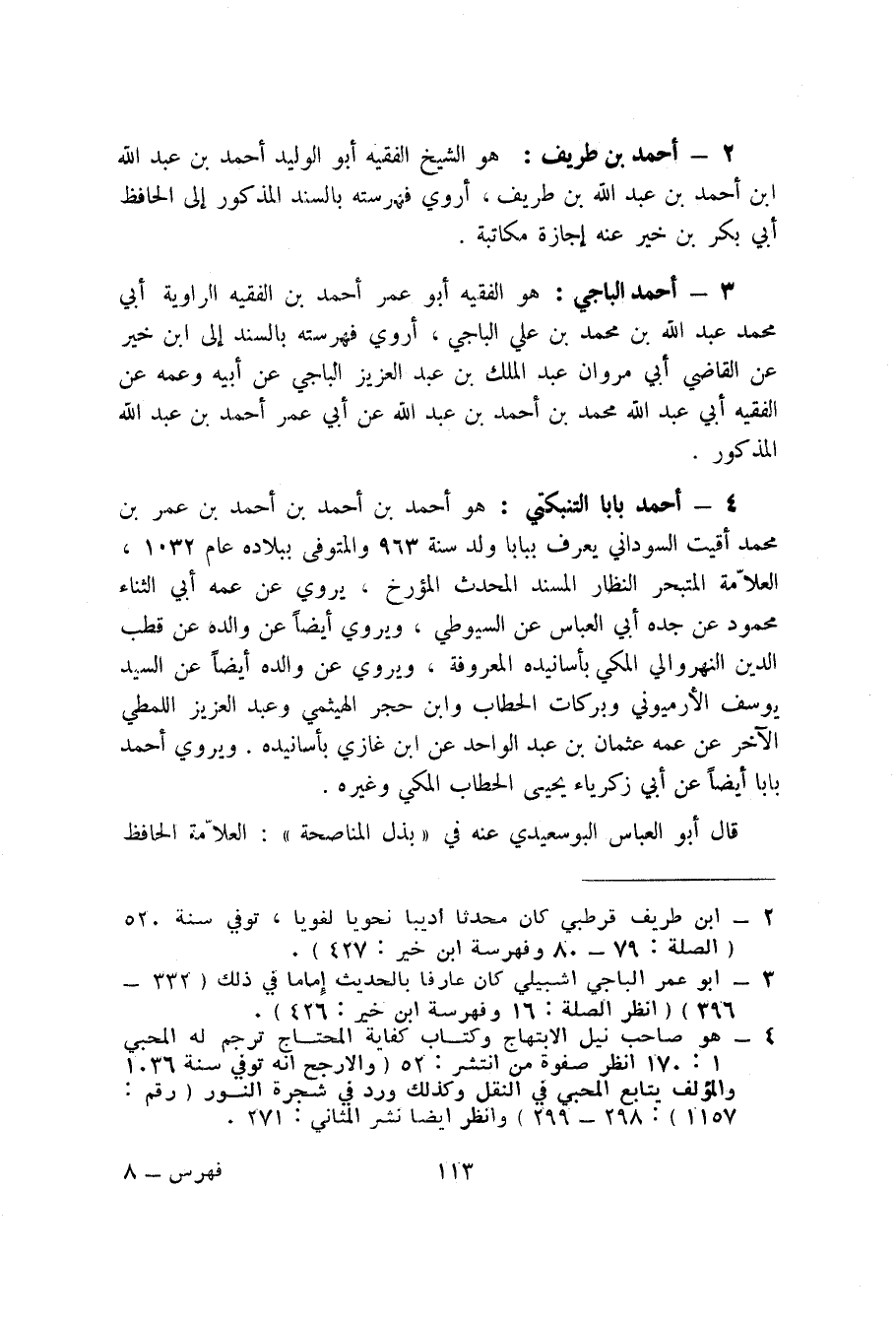 (3) هو صاحب نيل الابتهاج وكتاب كفاية المحتاج ترجم له المحبي 1: 170 انظر صفوة من انتشر: 52 (والأرجح أنه توفي سنة 1036 والمؤلف يتابع المحبي في النقل وكذلك ورد في شجرة النور (رقم: 1157) : 298 - 299) وانظر أيضاً نشر المثاني: 271.