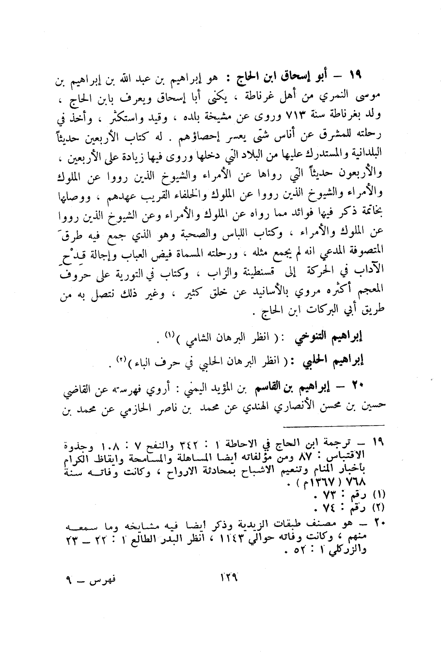 19 - أبو إسحاق ابن الحاج (1) : هو إبراهيم بن عبد الله بن إبراهيم بن موسى النمري من أهل غرناطة، يكنى أبا إسحاق ويعرف بابن الحاج، ولد بغرناطة سنة 713 وروى عن مشيخة بلده، وقيد واستكثر، وأخذ في رحلته للمشرق عن أناس شتى يعسر إحصاؤهم. له كتاب الأربعين حديثاً، البلدانية والمستدرك عليها من البلاد التي دخلها وروى فيها زيادة على الأربعين، والأربعون حديثاً التي رواها عن الأمراء والشيوخ الذين رووا عن الملوك والأمراء والشيوخ الذين رووا عن الملوك والخلفاء القريب عهدهم، ووصلها بخاتمة ذكر فيها فوائد مما رواه عن الملوك والأمراء وعن الشيوخ الذين رووا عن الملوك والأمراء، وكتاب اللباس والصحبة وهو الذي جمع فيه طرق المتصوفة المدعي انه لم يجمع مثله، ورحلته المسماة فيض العباب وإجالة قدح الآداب في الحركة إلى قسنطينة والزاب، وكتاب في التورية على حروف المعجم أكثره مروي بالأسانيد عن خلق كثير، وغيرذلك نتصل به من طريق أبي البركات ابن الحاج.