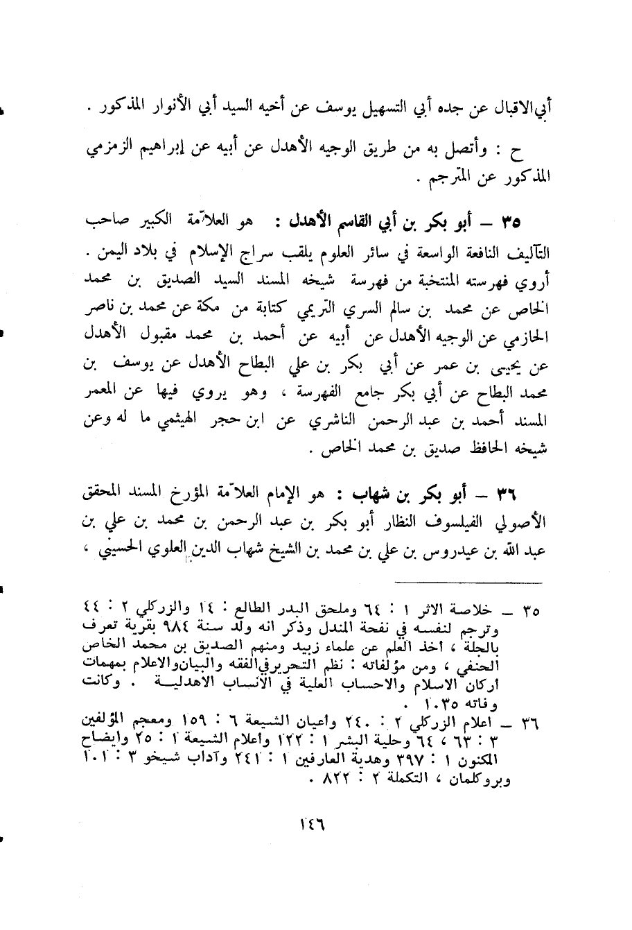 35 - أبو بكر بن أبي القاسم الأهدل (1) : هو العلامة الكبير صاحب التآليف النافعة الواسعة في سائر العلوم يلقب سراج الإسلام في بلاد اليمن، أروي فهرسته المنتخبة من فهرسة شيخه المسند السيد الصديق بن محمد الخاص عن محمد بن سالم السري التريمي كتابة من مكة عن محمد بن ناصر الحازمي عن الوجيه الأهدل عن أبيه عن أحمد بن محمد مقبول الأهدل عن يحيى بن عمر عن أبي بكر بن عليّ البطاح الأهدل عن يوسف بن محمد البطاح عن أبي بكر جامع الفهرسة، وهو يروي فيها عن المعمر المسند أحمد بن عبد الرحمن الناشري عن ابن حجر الهيثمي ما له وعن شيخه الحافظ صديق بن محمد الخاص.