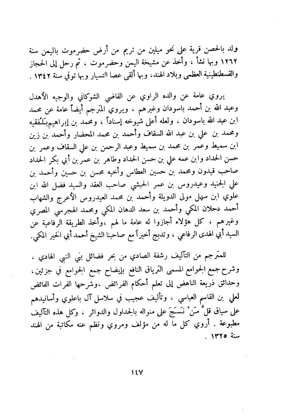 ولد بالحصن قرية على نحو ميلين من تريم من أرض حضرموت باليمن سنة 1262 وبها نشأ، وأخذ عن مشيخة اليمن وحضرموت، ثم رحل إلى الحجاز والقسطنطينية العظمى وبلاد الهند، وبها ألقى عصا التسيار وبها توفي سنة 1342.