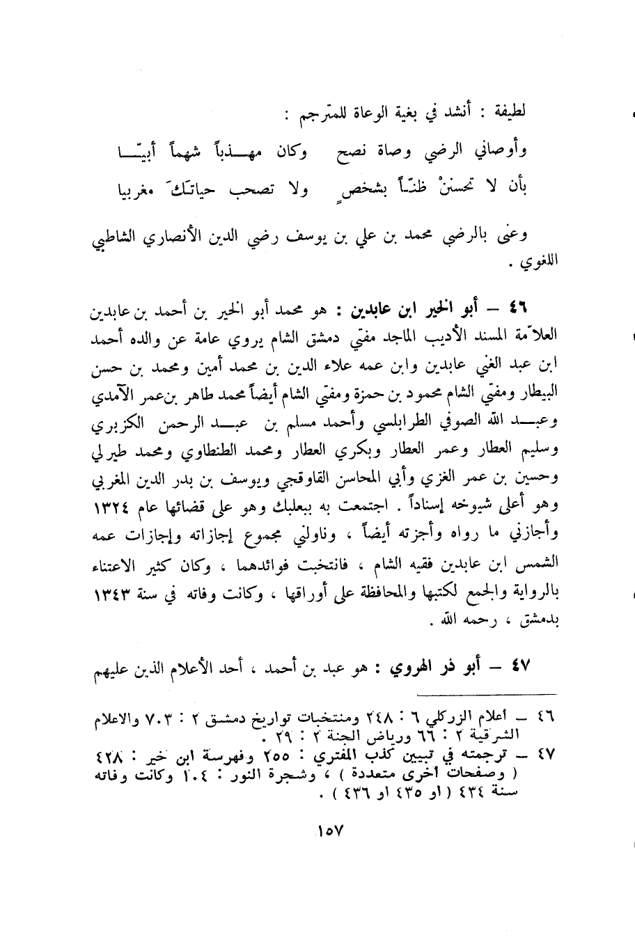 46 - أبو الخير ابن عابدين (1) : هو محمد أبو الخير بن أحمد بن عابدين العلامة المسند الأديب الماجد مفتي دمشق يروي عامة عن والده أحمد ابن عبد الغني عابدين وابن عمه علاء الدين بن محمد أمين ومحمد بن حسن البيطار ومفتي الشام محمود بن حمزة ومفتي الشام أيضاً محمد طاهر بن عمر الآمدي وعبد الله الصوفي الطرابلسي وأحمد مسلم بن عبد الرحمن الكزبري وسليم العطار وعمر العطار وبكري العطار ومحمد الطنطاوي ومحمد طيرلي وحسين بن عمر الغزي وأبي المحاسن القاوقجي ويوسف بن بدر الدين المغربي وهو أعلى شيوخه إسناداً، اجتمعت به ببعلبك وهو على قضائها عام 1324 وأجازتي ما رواه وأجزته أيضاً، وناولني مجموع إجازاته وإجازات عمه الشمس ابن عابدين فقيه الشام، فانتخبت فوائدهما، وكان كثير الاعتناء بالرواية والجمع لكتبها والمحافظة على أوراقها، وكانت وفاته في سنة 1343 بدمشق، رحمه الله.