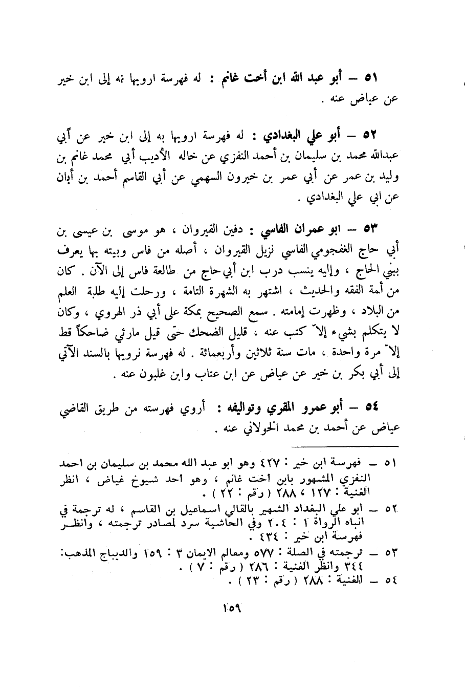 52 - أبو عليّ البغدادي (2) : له فهرسة ارويها به إلى ابن خير عن أبي عبد الله محمد بن سليمان بن أحمد النفزي عن خاله الأديب أبي محمد غانم بن وليد بن عمر عن أبي عمر بن خيرون السهمي عن أبي القاسم أحمد بن أبان عن أبي عليّ البغدادي.