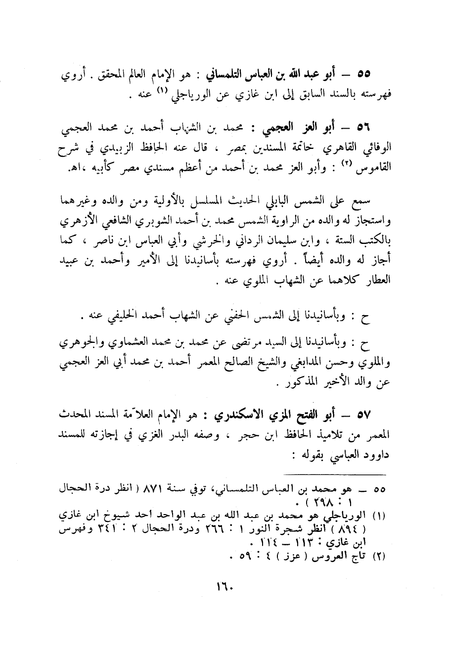 56 - أبو العز العجمي: محمد بن الشهاب أحمد بن محمد العجمي الوفائي القاهري خاتمة المسندين بمصر، قال عنه الحافظ الزبيدي في شرح القاموس (3) : وأبو العز محمد بن أحمد من أعظم مسندي مصر كأبيه. اه.