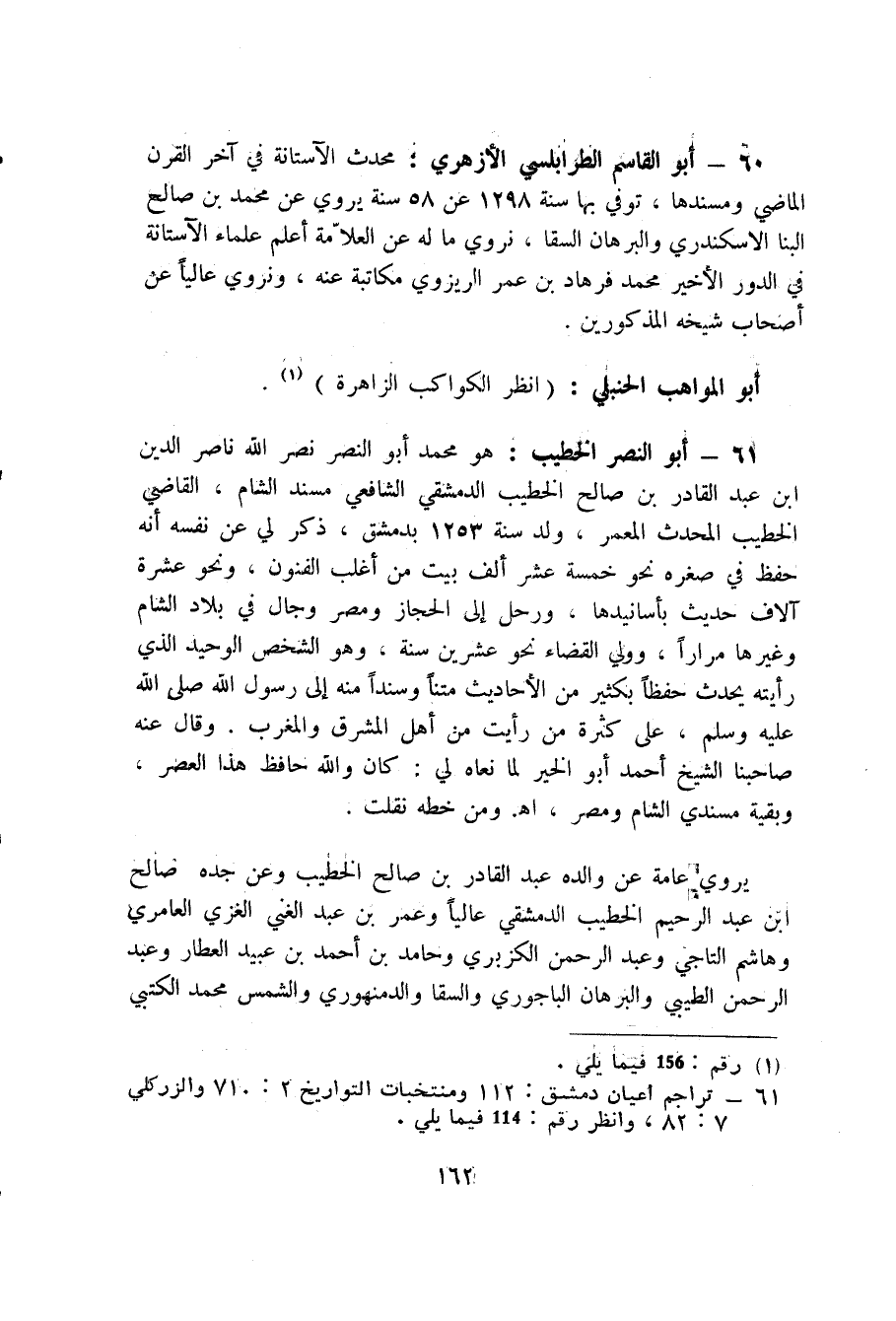 61 - أبو النصر الخطيب (2) : هو محمد أبو النصر نصر الله ناصر الدين ابن عبد القادر بن صالح الخطيب الدمشقي الشافعي مسند الشام، القاضي الخطيب المحدث المعمر، ولد سنة 1253 بدمشق، ذكر لي عن نفسه أنه حفظ في صغره نحو خمسة عشر ألف بيت من أغلب الفنون، ونحو عشرة آلاف حديث بأسانيدها، ورحل إلى الحجاز ومصر وجال في بلاد الشام وغيرها مراراً، وولي القضاء نحو عشرين سنة، وهو الشخص الوحيد الذي رأيته يحدث حفظاً بكثير من الأحاديث متناً وسنداً منه إلى رسول الله صلى الله عليه وسلم، على كثرة من رأيت من أهل المشرق والمغرب. وقال عنه صاحبنا الشيخ أحمد أبو الخير لما نعاه لي: كان والله حافظ هذا العصر، وبقية ميندي الشام ومصر، اه. ومن خطه نقلت.