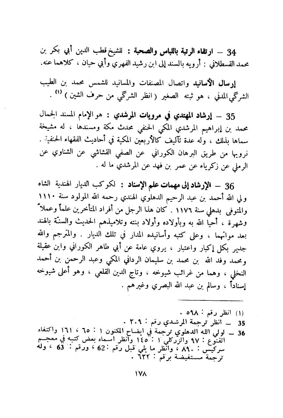 36 - الإرشاد إلى مهمات علم الإسناد (3) : لكوكب الديار الهندية الشاه ولي الله أحمد بن عبد الرحيم الدهلوي الهندي رحمه الله سنة 111. والمتوفى بدهلي سنة 1176. كان هذا الرجل من أفراد المتأخرين علماً وعملاً وشهرة، أحيا الله به وبأولاده وأولاد بنته وتلاميذهم الحديث والسنة بالهند بعد مواتهما، وعلى كتبه وأسانيده المدار في تلك الديار. والمترجم والله جدير بكل إكبار واعتبار، يروي عامة عن أبي طاهر الكوراني وابن عقيلة ومحمد وفد الله بن محمد بن سليمان الرداني المكي وعبد الرحمن بن أحمد النخلي، وهما من غرائب شيوخه، وتاج الدين القلعي، وهو أعلى شيوخه إسناداً، وسالم بن عبد الله البصري وغيرهم.