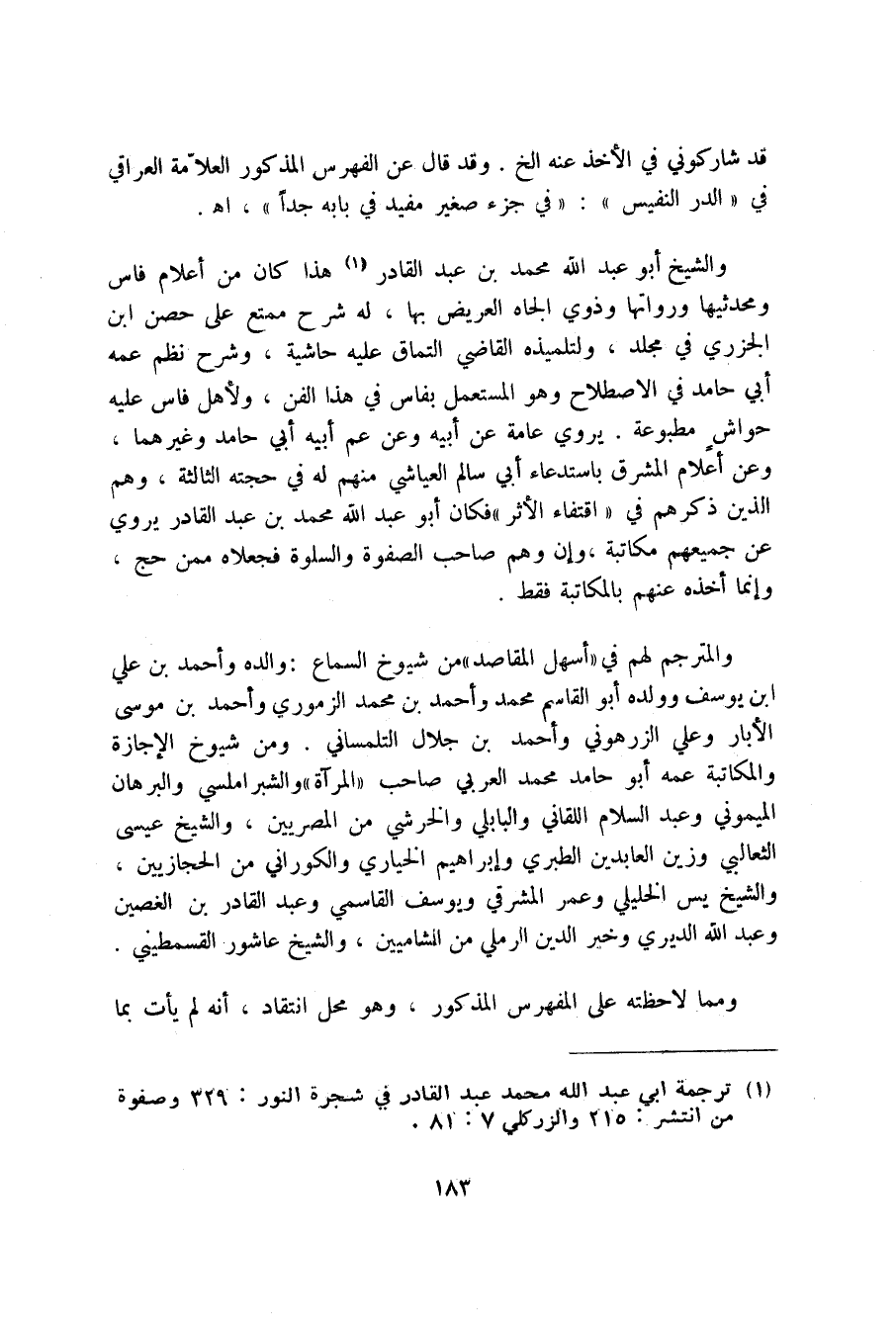 (1) ترجمة أبي عبد الله محمد عبد القادر في شجرة النور: 329 وصفوة من انتشر: 215 والزركلي 7: 81.