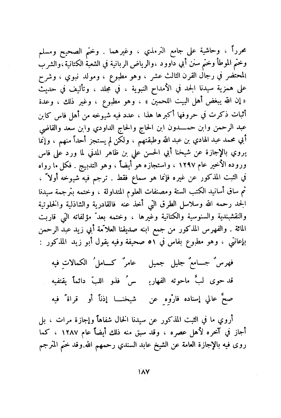 محرراً. وحاشية على جامع الترمذي، وغيرهما. وختم الصحيح ومسلم وختم الموطأ وختم سنن أبي داوود، والرياض الربانية في الشعبة الكتانية، والشرب المحتضر في رجال القرن الثالث عشر، وهو مطبوع، ومولد نبوي، وشرح على همزية سيدنا الجد في الأمداح النبوية، في مجلد، وتأليف في حديث " إن الله يبغض أهل البيت اللحمين "، وهو مطبوع، وغير ذلك، وعدة أثبات ذكرت في حروفها أكبرها هذا، عدد فيه شيوخه من أهل فاس كابن عبد الرحمن وابن حمدون ابن الحاج والحاج الداودي وابن سعد والقاضي أبي محمد عبد الهادي بن عبد الله وطبقتهم، ولكن لم يستجز أحداً منهم، وإنما يروي بالإجازة عن شيخنا أبي الحسن عليّ بن ظاهر المدني لما ورد على فاس وروده الأخير عام 1297، واستجازه هو أيضاً، وهو التدبيج. فكل ما رواه في الثبت المذكور عن غيره فإنما هو سماع فقط. ترجم فيه شيوخه أولاً، ثم ساق أسانيد الكتب الستة ومصنفات العلوم المتداولة، وختمه بترجمة سيدنا الجد رحمه الله وسلاسل الطرق التي أخذ عنه فالقادرية والشاذلية والخلوتية والنقشبندية والسنوسية والكتانية وغيرها، وختمه بعد مؤلفاته التي قاربت المائة. والفهرس المذكور من جمع ابنه صديقنا العلامة أبي زيد عبد الرحمن بإعانتي، وهو مطبوع بفاس في 51 صحيفة وفيه يقول أبو زيد المذكور: