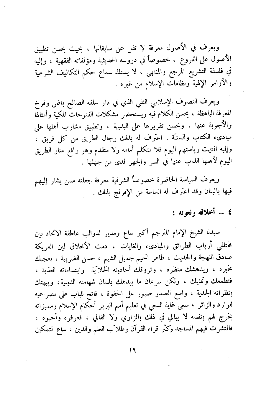لذلك هو حفظه الله أول من يتلمذ لكل صالح مصلح إصلاحاً صالحاً بالبلاد مرتكزاً على الدين والقومية المغربية، أما لغيره فهو ممن لا تعمل فيهم تيارات هاته الأبخرة، ولا تهزهم هذه الرياح والزلازل. فهو الجبل الثابت نحو صواعقها الذي لا تعمل فيه معامل الإفساد ولو بقي وحده. وأكبر شرف يتحدى به ويختص به عن أنداده عداوة الملحدين وسباب المفسدين ودحض المساوئ التي يلحقها ويلزقها به المتزلفون، وستعلم الأجيال المقبلة أحقية مباديه هذه وأصوبيتها فتشكره، فيشكرها الإنصاف وأهله، أو تكفر به فلا يكون