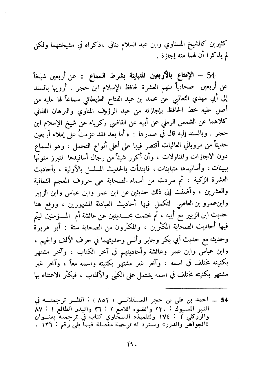 54 - الإمتاع بالأربعين المتباينة بشرط السماع (1) : عن أربعين شيخاً عن أربعين صحابياً منهم العشرة لحافظ الإسلام ابن حجر، أرويها بالسند إلى أبي مهدي الثعالبي عن محمد بن عبد الفتاح الطهطائي سماعاً لها عليه من أصل عليه خط الحافظ بإجازته من عبد الرؤوف المناوي والبرهان اللقاني كلاهما عن الشيخ الرملي عن أبيه عن القاضي زكرياء عن شيخ الإسلام ابن حجر. وبالسند إليه قال في صدرها: " أما بعد فقد عزمت على إملاء أربعين حديثاً من مروياتي العاليات أقتصر فيها على أعلى أنواع التحمل، وهو السماع دون الإجازات والمناولات، وأن أكرر شيئاً من رجال أسانيدها لتبرز متونها ببينات، وأسانيدها متباينات، فابتدأت بالحديث المسلسل بالأولية، بأحاديث العشرة الزكية، ثم سردت من أسماء الصحابة على حروف المعجم الثمانبة والعشرين، وأضفت إلى ذلك حديثين عن ابن عمر وابن عباس وابن الزبير وابن عمرو بن العاصي لتكمل فيها أحاديث العبادلة المشهورين، ووقع هنا حديث ابن الزبير مع أبيه، ثم ختمت بحديثين عن عائشة أم المؤمنين ليتم فيها أحاديث الصحابة المكثرين، والمكثرون من الصحابة ستة: أبو هريرة وحديثه مع حديث أبي بكر وجابر وأنس وحديثهما في حرف الألف والجيم، وابن عباس وابن عمر وعائشة وأحاديثهم في آخر الكتاب، وآخر مشتهر بكنيته مختلف في اسمه، وآخر غير مشتهر بكنيته واسمه معاً، وآخر غير مشتهر بكنيته مختلف في اسمه يشتمل على الكنى والألقاب، فيكثر الاعتناء بها