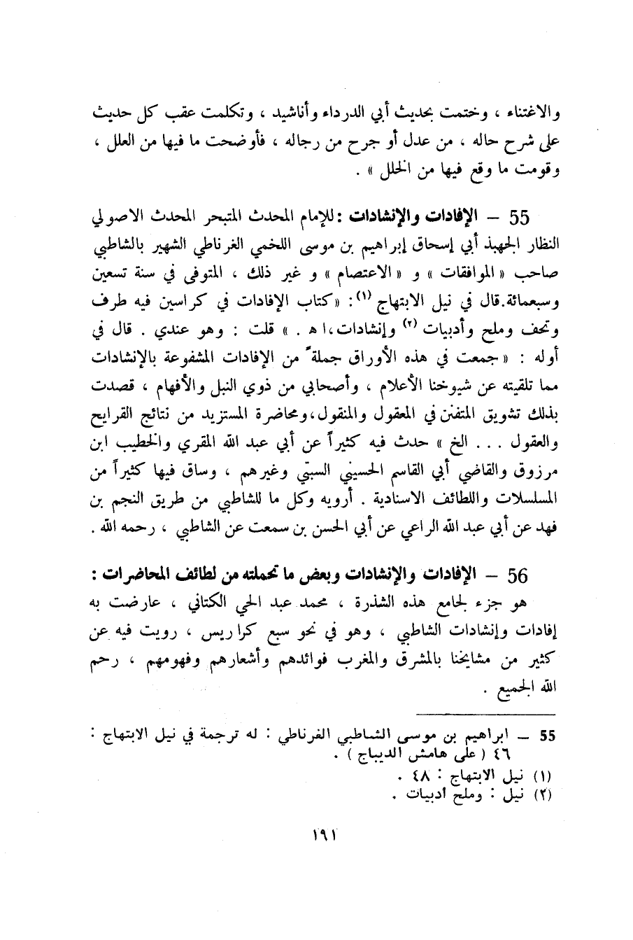 55 - الإفادات والإنشادات (1) : للإمام المحدث المتبحر المحدث الاصولي النظار الجهبذ أبي إسحاق إبراهيم بن موسى اللخمي الغرناطي الشهير بالشاطبي صاحب " الموافقات " و " الاعتصام " وغير ذلك، المتوفى في سنة تسعين وسبعمائة، قال في نيل الابتهاج (2) : " كتاب الإفادات في كراسين فيه طرف وتحف وملح وأدبيات (3) وإنشادات، اه. " قلت: وهو عندي، قال في أوله: " جمعت في هذه الأوراق جملةً من الإفادات المشفوعة بالإنشادات مما تلقيته عن شيوخنا الأعلام، وأصحابي من ذوي النبل والأفهام، قصدت بذلك تشويق المتفنن في المعقول والمنقول، ومحاضرة المستزيد من نتائج القرايح والعقول ... الخ " حدث فيه كثيراً عن أبي عبد الله المقري والخطيب ابن مرزوق والقاضي أبي القاسم الحسيني السبتي وغيرهم، وساق فيها كثيراً من المسلسلات واللطائف الاسنادية. أرويه وكل ما للشاطبي من طريق النجم بن فهد عن أبي عبد الله الراعي عن أبي الحسن بن سمعت عن الشاطبي، رحمه الله.