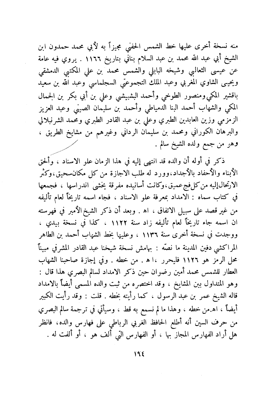 ذكر في أوله أن والده قد انتهى إليه في هذا الزمان علو الإسناد، وألحق الأبناء والأحفاد بالأجداد، وورد له طلب الإجازة من كل مكان سحيق، وكثر الارتحال إليه من كل فج عميق، وكانت أسانيده مفرقة يخشى اندراسها، فجمعها في كتاب سماه: الإمداد بمعرفة علو الإسناد، فجاء اسمه تاريخاً لعام تأليفه من غير قصد على سبيل الاتفاق، اه، وبعد أن ذكر الشيخ الأمير في فهرسته ان اسمه جاء تاريخاً لعام تأليفه زاد سنة 1122. كذا نسخة بيدي، ووجدت في نسخة أخرى سنة 1136، وعليها بخط الشهاب أحمد بن الطاهرالمراكشي دفين المدينة ما نصه: بهامش نسخة شيخنا عبد القادر المشرفي مبيناً على الرمز هو 1126 فليحرر، اه. من خطه. وفي إجازة صاحبنا الشهاب العطار للشمس محمد أمين رضوان حين ذكر الامداد لسالم البصري هذا قال: وهو المتداول بين المشايخ، وقد أختصره من ثبت والده المسمى إيضاً بالامداد قاله الشيخ عمر بن عبد الرسول، كما رأيته بخطه. قلت: وقد رأيت الكبيرأيضاً، اه. من خطه، وهذا ما لم نسمع به قط، وسيأتي في ترجمة سالم البصري من حرف السين أنه أطلع الحافظ الغربي الرباطي على فهارس والده، فانظر هل أراد الفهارس المجاز بها، أو الفهارس التي ألف هو، أو ألفت له.