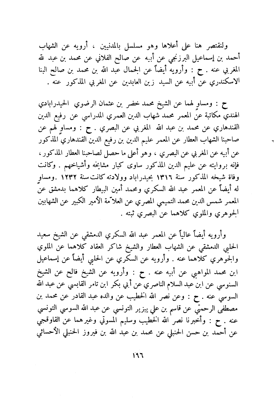ح: ومساو لهما عن الشيخ محمد خضر بن عثمان الرضوي الحيدرابادي الهندي مكاتبة عن المعمر محمد شهاب الدين العمري المدراسي عن رفيع الدين القندهاري عن محمد بن عبد الله المغربي عن البصري. ح: ومساو لهم عن صاحبنا الشهاب العطار عن المعمر عليم الدين بن رفيع الدين القندهاري المذكور عن أبيه عن المغربي عن البصري، وهو أعلى ما حصل لصاحبنا العطار المذكور، فإنه بروايته عن عليم الدين المذكور ساوى كبار مشايخه وأشياخهم. وكانت وفاة شيخه المذكور سنة 1316 بحيدراباد وولادته كانت سنة 1232. ومساو له أيضاً عن المعمر عبد الله السكري ومحمد أمين البيطار كلاهما بدمشق عن المعمر شمس الدين محمد التميمي المصري عن العلامة الأمير الكبير عن الشهابين الجوهري والملوي كلاهما عن البصري ثبته.
