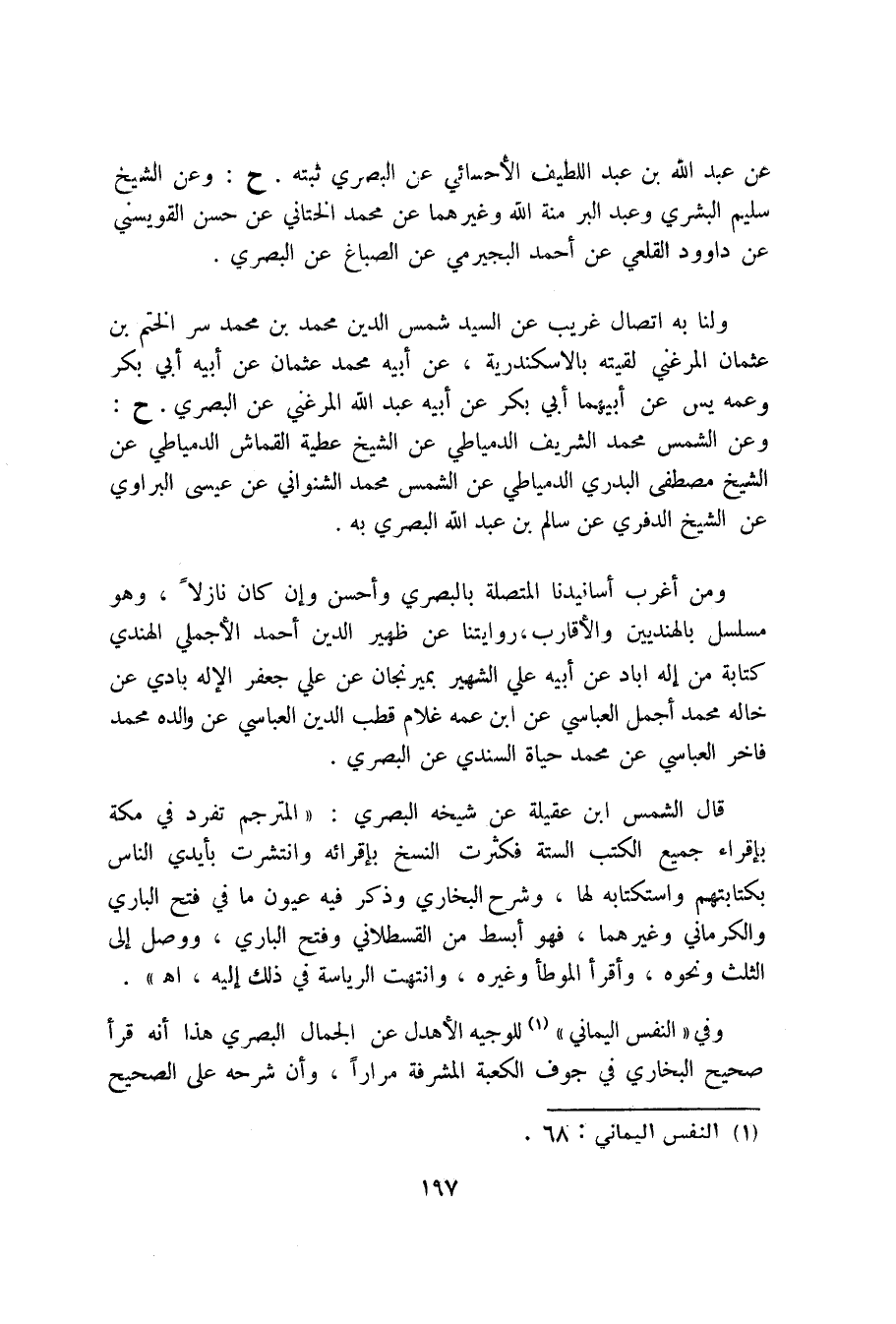 ومن أغرب أسانيدنا المتصلة بالبصري وأحسن وإن كان نازلاً، وهو مسلسل بالهنديين والأقارب، روايتنا عن ظهير الدين أحمد الأجملي الهندي كتابة من إله اباد عن أبيه عليّ الشهير بميرنجان عن عليّ جعفر الإلهبادي عن خاله محمد أجمل العباسي عن ابن عمه غلام قطب الدين العباسي عن والده محمد فاخر العباسي عن محمد حياة السندي عن البصري.