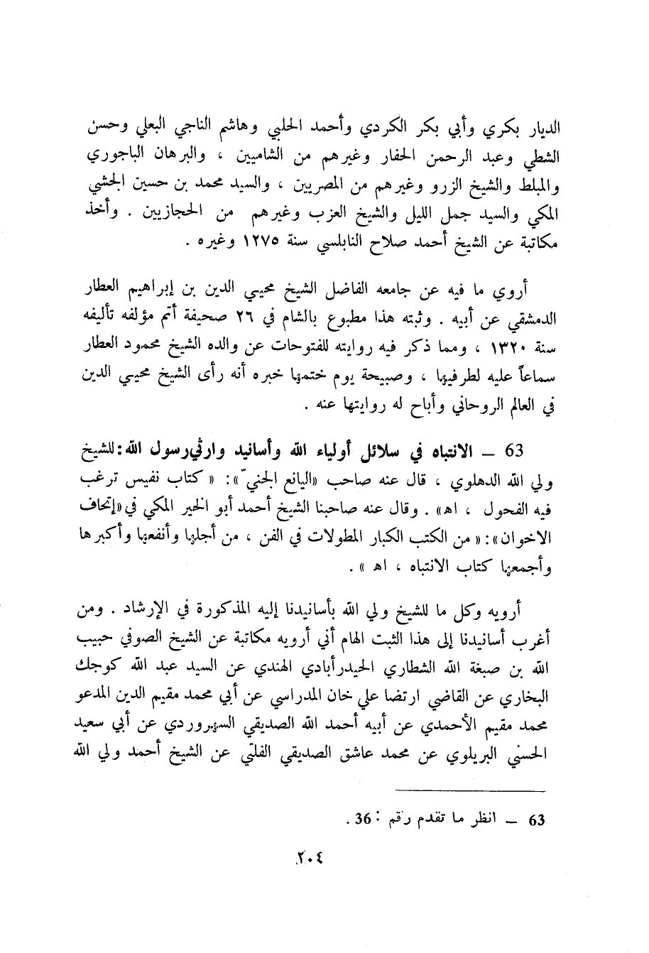 63 - الانتباه في سلائل أولياء الله وأسانيد وارثي رسول الله (1) : للشيخ ولي الله الدهلوي، قال عنه صاحب " اليانع الجني ": " كتاب نفيس ترغب فيه الفحول، اه ". وقال عنه صاحبنا الشيخ أحمد أبو الخير المكي في " إتحاف الاخوان ": " من الكتب الكبار المطولات في الفن، من أجلها وأنفعها وأكبرها وأجمعها كتاب الانتباه، اه ".