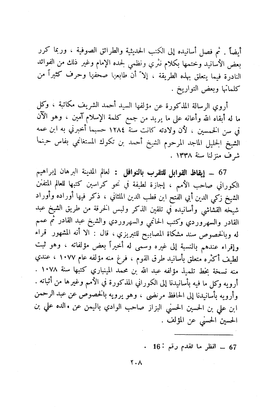 67 - إيقاظ القوابل للتقرب بالنوافل (1) : لعالم المدينة البرهان إبراهيم الكوراني صاحب الأمم، إجازة لطيفة في نحو كراسين كتبها للعالم المتفنن الشيخ زكي الدين أبي الفتح ابن قطب الدين الملثاني، ذكر فيها أوراده وأوراد شيخه القشاشي وأسانيده في تلقين الذكر ولبس الخرقة من طريق الشيخ عبد القادر والسهروردي وكتب الحاتمي والسهروردي والشيخ عبد القادر ثم عمم له وبالخصوص سند مشكاة المصابيح للتبريزي، قال: ألا أنه المشهور قراء وإقراء عندهم بالنسبة إلى غيره وسمى له أخيراً بعض مؤلفاته، وهو ثبت لطيف أكثره متعلق بأسانبد طرق القوم، فرغ منه مؤلفه عام 1.77، عندي منه نسخة بخط تلميذ مؤلفه عبد الله بن محمد المينباري كتبها سنة 1078. أرويه وكل ما فيه بأسانيدنا إلى الكوراني المذكورة في الأمم وغيرها من إثباته. وأرويه بأسانيدنا إلى الحافظ مرتضى، وهو يرويه بالخصوص عن عبد الرحمن ابن عليّ بن الحسين الحسني البزاز صاحب الوادي باليمن عن والده عليّ بن الحسين الحسني عن المؤلف.