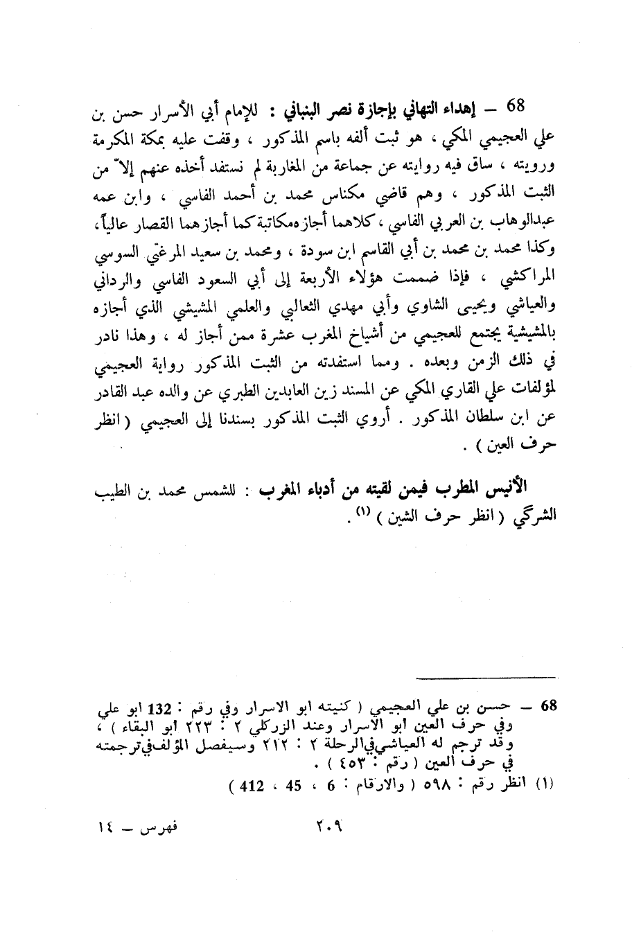68 - إهداء التهاني بإجازة نصر البنباني (1) : للإمام أبي الأسرار حسن بن عليّ العجيمي المكي، هو ثبت ألفه باسم المذكور، وقفت عليه بمكة المكرمة ورويته، ساق فيه روايته عن جماعة من المغاربة لم نستفد أخذه عنهم إلا من الثبت المذكور، وهم قاضي مكناس محمد بن أحمد الفاسي، وابن عمه عبد الوهاب بن العربي الفاسي، كلاهما أجازه مكاتبة كما أجازهما القصار عالياً، وكذا محمد بن محمد بن أبي القاسم ابن سودة، ومحمد بن سعيد المرغتي السوسي المراكشي، فإذا ضممت هؤلاء الأربعة إلى أبي السعود الفاسي والرداني والعياشي ويحيى الشاوي وأبي مهدي الثعالبي والعلمي المشيشي الذي أجازه بالمشيشية يجتمع للعجيمي من أشياخ المغرب عشرة ممن أجاز له، وهذا نادر في ذلك الزمن وبعده. ومما استفدته من الثبت المذكور رواية العجيمي لمؤلفات عليّ القاري المكي عن المسند زين العابدين الطبري عن والده عبد القادر عن ابن سلطان المذكور. أروي الثبت المذكور بسندنا إلى العجيمي (انظر حرف العين) .