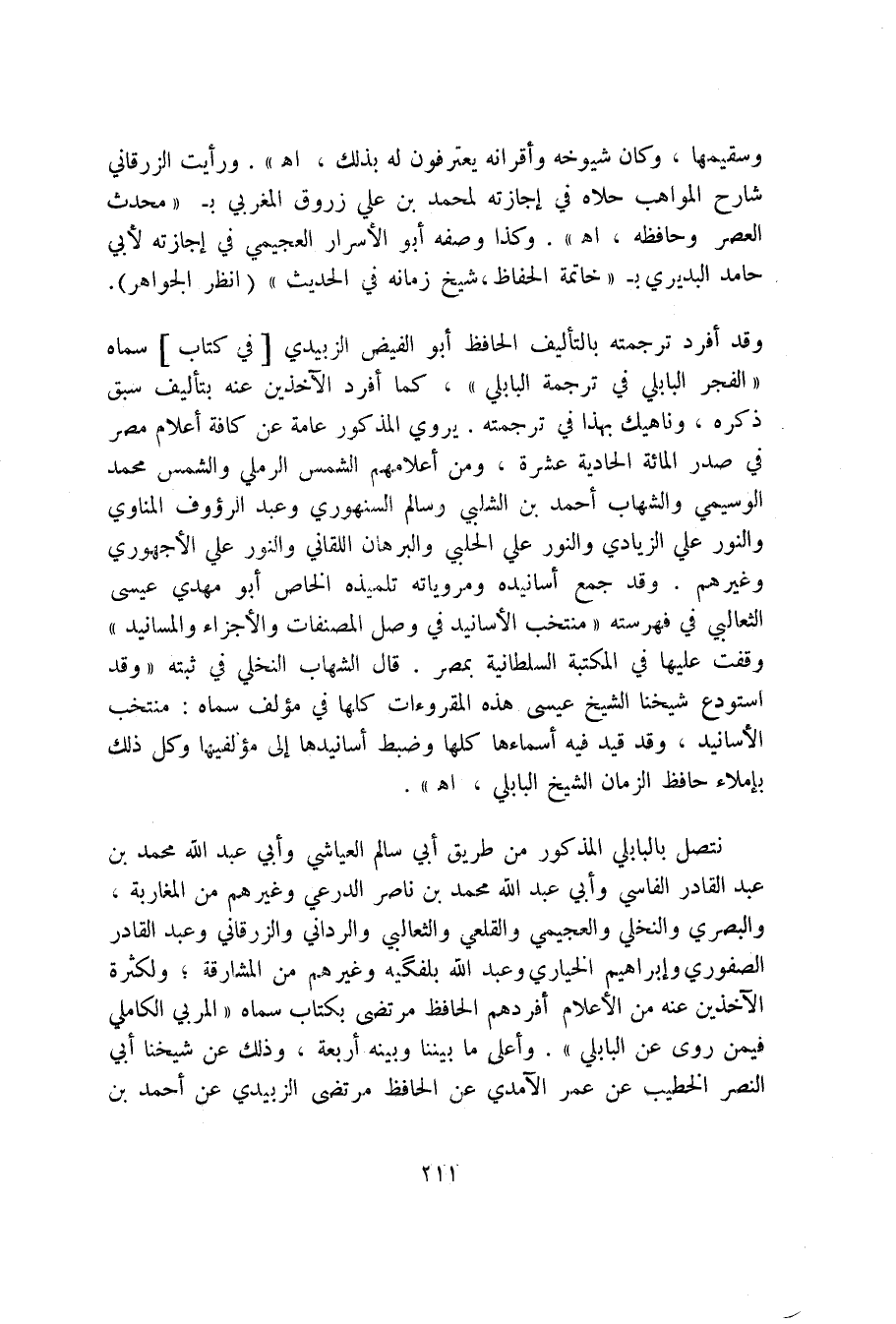 نتصل بالبابلي المذكور من طريق أبي سالم العياشي وأبي عبد الله محمد بن عبد القادر الفاسي وأبي عبد الله محمد بن ناصر الدرعي وغيرهم من المغاربة، والبصري والنخلي والعجيمي والقلعي والثعالبي والرداني والزرقاني وعبد القادر الصفوري وإبراهيم الخياري وعبد الله بلفكيه وغيرهم من المشارقة، ولكثرة الآخذين عنه من الأعلام أفردهم الحافظ مرتضى بكتاب سماه " المربي الكاملي فيمن روى عن البابلي ". وأعلى مابيننا وبينه أربعة، وذلك عن شيخنا أبي النصر الخطيب عن عمر الآمدي عن الحافظ مرتضى الزبيدي عن أحمد بن