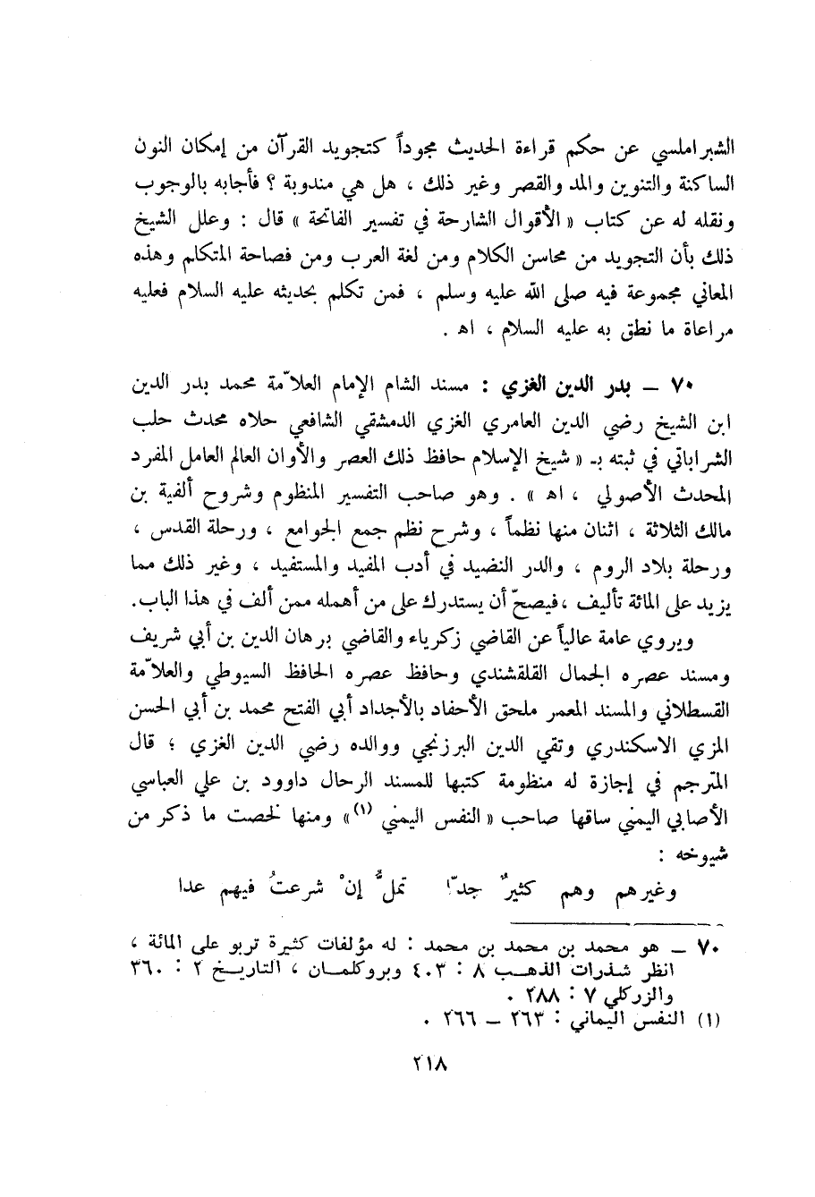 70 - بدر الدين الغزي (1) : مسند الشام الإمام العلامة محمد بدر الدين ابن الشيخ رضي الدين العامري الغزي الدمشقي الشافعي حلاه محدث حلب الشراباتي في ثبته ب " شيخ الإسلام حافظ ذلك العصر والأوان العالم العامل المفرد المحدث الأصولي، اه ". وهو صاحب التفسير المنظوم وشروح ألفية بن مالك الثلاثة، اثنان منها نظماً، وشرح نظم جمع الجوامع، ورحلة القدس، ورحلة بلاد الروم، والدر النضيد في أدب المفيد والمستفيد، وغيرذلك مما يزيد على المائة تأليف، فيصح أن يستدرك على من أهمله ممن ألف في هذا الباب.