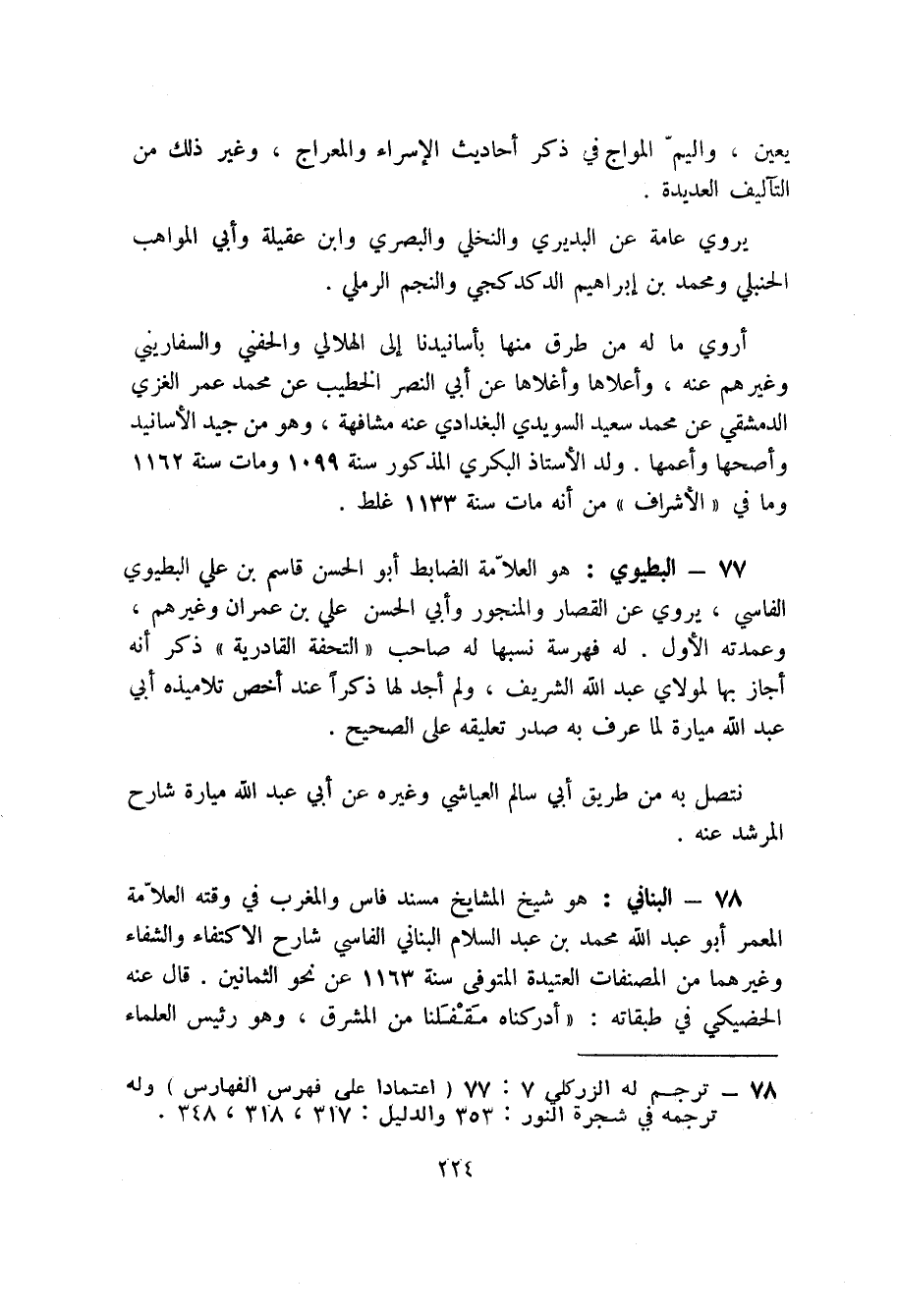78 - البناني: هو شيخ المشايخ مسند فاس والمغرب في وقته العلامة المعمر أبو عبد الله محمد بن عبد السلام البناني الفاسي شارح الاكتفاء والشفاء وغيرهما من المصنفات العتيدة المتوفى سنة 1163 عن نحو الثمانين. قال عنه الحضيكي في طبقاته: " أدركناه مقفلنا من المشرق، وهو رئيس العلماء