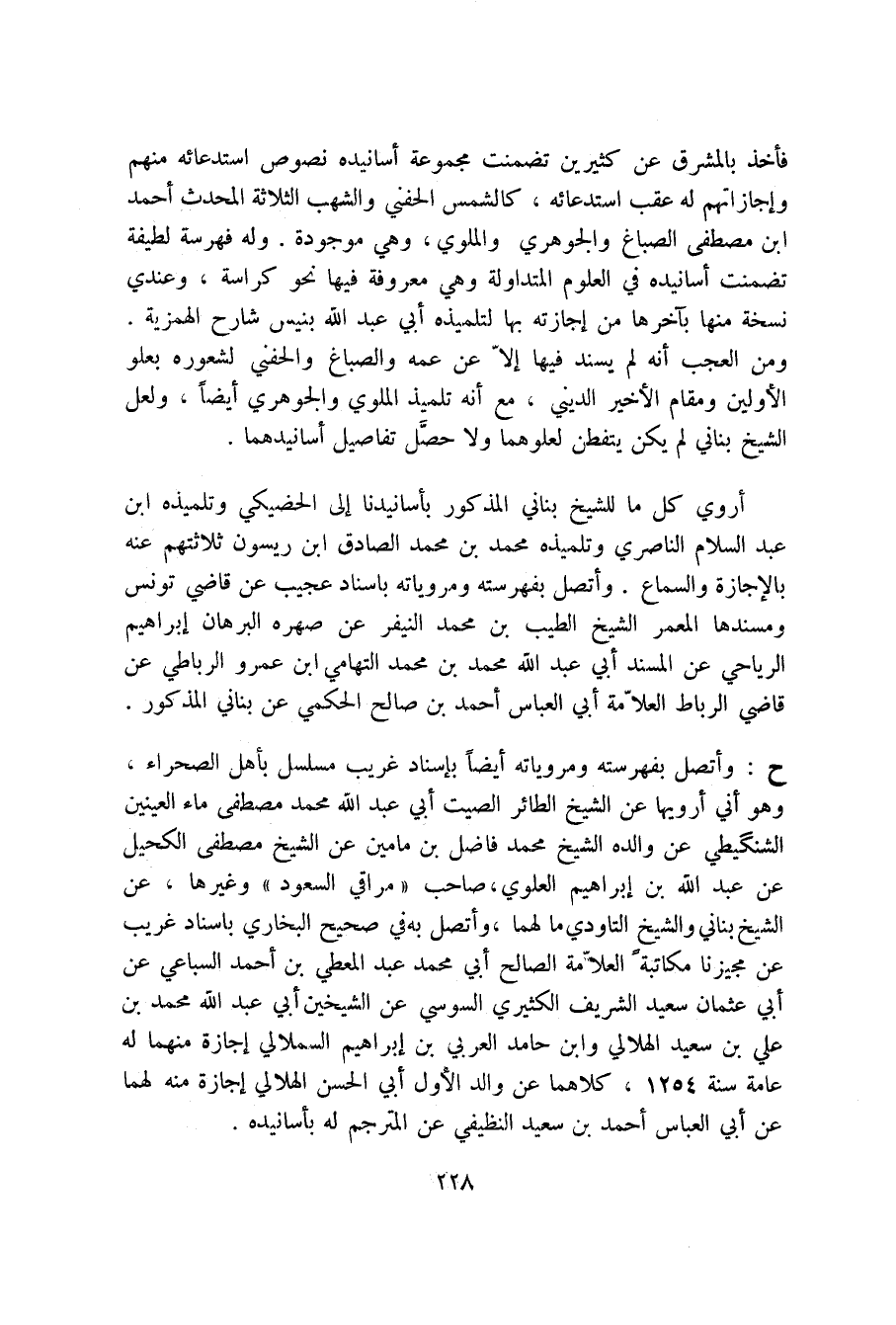 أروي كل ما للشيخ بناني المذكور بأسانيدنا إلى الحضيكي وتلميذه ابن عبد السلام الناصري وتلميذه محمد بن محمد الصادق ابن ريسون ثلاثتهم عنه بالإجازة والسماع، وأتصل بفهرسته ومروياته بإسناد عجيب عن قاضي تونس ومسندها المعمر الشيخ الطيب بن محمد النيفر عن صهره البرهان إبراهيم الرياحي عن المسند أبي عبد الله محمد بن محمد التهامي ابن عمرو الرباطي عن قاضي الرباط العلامة أبي العباس أحمد بن صالح الحكمي عن بناني المذكور. ح: وأتصل بفهرسته ومروياته أيضاً بإسناد غريب مسلسل بأهل الصحراء، وهو أني أرويها عن الشيخ الطائر الصيت أبي عبد الله محمد مصطفى ماء العينين الشنكيطي عن والده الشيخ محمد فاضل بن مامين عن الشيخ مصطفى الكحيل عن عبد الله بن إبراهيم العلوي، صاحب " مراقي السعود " وغيرها، عن الشيخ بناني والشيخ التاودي مالهما، وأتصل به في صحيح البخاري باسناد غريب عن مجيزنا مكاتبة العلامة الصالح أبي محمد عبد المعطي بن أحمد السباعي عن أبي عثمان سعيد الشريف الكثيرب السوسي عن الشيخين أبي عبد الله محمد بن عليّ بن سعيد الهلالي وابن حامد العربي بن إبراهيم السملالي إجازة منهما له عامة سنة 1254، كلاهما عن والد الأول أبي الحسن الهلالي إجازة منه لهما عن أبي العباس أحمد بن سعيد النظيفي عن المترجم له بأسانيده.