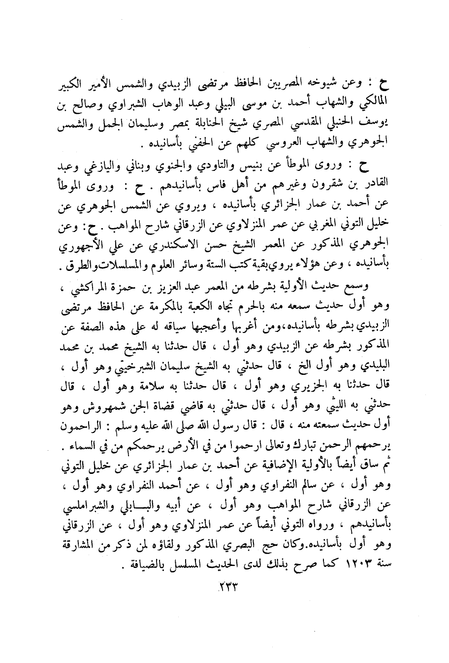 وسمع حديث الأولية بشرطه عن المعمر عبد العزيز بن حمزة المراكشي، وهو أول حديث سمعه منه بالحرم تجاه الكعبة المكرمة عن الحافظ مرتضى الزبيدي بشرطه بأسانيده، ومن أغربها وأعجبها سياقه له على هذه الصفة عن المذكور بشرطه عن الزبيدي وهو أول، قال حدثنا به الشيخ محمد بن محمد البليدي وهو أول الخ، قال حدثني به الشيخ سليمان الشبرخيتي وهو أول، قال حدثنا به الجزيري وهو أول، قال حدثنا به سلامة وهو أول، قال حدثني به الليثي وهو أول، قال حدثني به قاضي قضاة الجن شمهروش وهو أول حذيث سمعته منه، قال: قال رسول الله صلى الله عليه وسلم: الراحمون يرحمهم الرحمن تبارك وتعالى ارحموا من في الأرض يرحمكم من في السماء. ثم ساق أيضاً بالأولية الإضافية عن أحمد بن عمار الجزائري عن خليل التوني وهو أول، عن سالم النفراوي وهو أول، عن أحمد النفراوي وهو أول، عن الزرقاني شارح المواهب وهو أول، عن أبيه والبابلي والشبراملسي بأسانيدهم، ورواه التوني أيضاً عن عمر المنزلاوي وهو أول، عن الزرقاني وهو أول بأسانيده. وكان حج البصري المذكور ولقاؤه لمن ذكر من المشارقة سنة 1203 كما صرح بذلك لدى الحديث المسلسل بالضيافة.