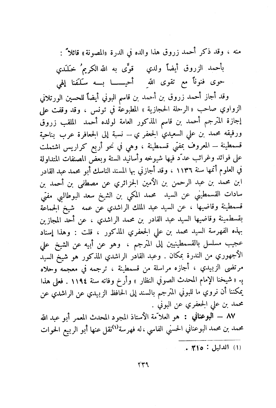 حوى فنوناً مع تقوى الله ... أحيا به سلفنا إلهي وقد أجاز أحمد زروق بن أحمد بن قاسم البوني أيضاً للحسين الورتلاني الزواوي صاحب " الرحلة الحجازية " المطبوعة في تونس، وقد وقفت على إجازة المترجم أحمد بن قاسم المذكور العامة لولده أحمد الملقب زروق ورفيقه محمد بن عليّ السعيدي الجعفري - نسبة إلى الجعافرة عرب بناحية قسمطينة - المعروف بمفتي قسمطينة، وهي في نحو أربع كراريس اشتملت على فوائد وغرائب عدد فيها شيوخه وأسانيد الستة وبعض المصنفات المتداولة في العلوم أتمها سنة 1136، وقد أجازني بها المسند الناسك أبو محمد عبد القادر ابن محمد بن عبد الرحمن بن الأمين الجزائري عن مصطفى بن أحمد بن سادات القسمطيني عن السيد محمد المكي بن الشيخ سعد البوطالبي مفتي قسمطينة وقاضيها، عن السيد عبد الملك الراشدي عن عمه شيخ الجماعة بقسمطينة وقاضيها السيد عبد القادر بن محمد الراشدي، عن أحد المجازين بهذه الفهرسة السيد محمد بن عليّ الجعفري المذكور، قلت: وهذا إسناد عجيب مسلسل بالقسمطينيين إلى المترجم، وهو عن أبيه عن الشيخ عليّ الأجهوري من الندرة بمكان. وعبد القادر الراشدي المذكور هو شيخ السيد مرتضى الزبيدي، أجازه مراسلة من قسمطينة، ترجمه في معجمه وحلاه ب " شيخنا الإمام المحدث الصوفي النظار " وأرخ وفاته سنة 1194. فعلى هذا يمكننا أن نروي ما للبوني المترجم بالسند إلى الحافظ الزبيدي عن الراشدي عن محمد بن عليّ الجعفري عن البوني.