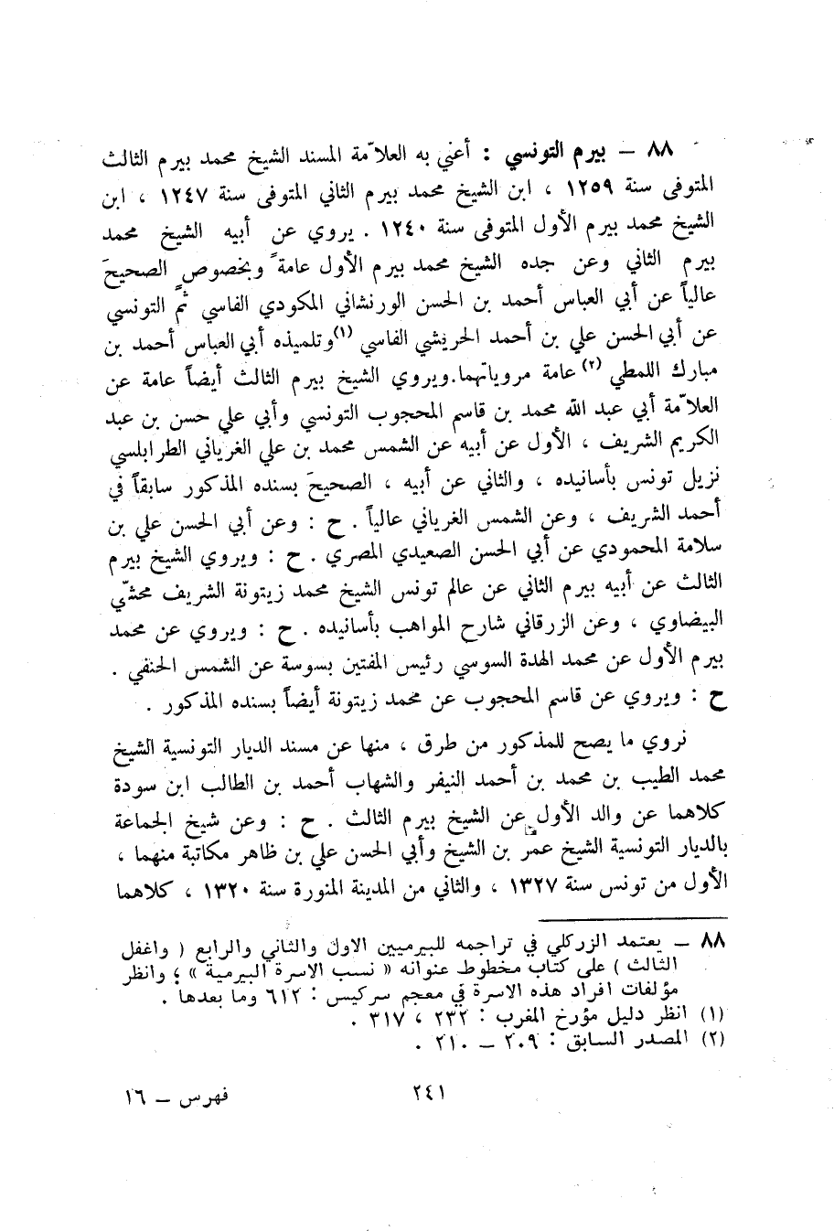 88 - بيرم التونسي (1) : أعني به العلامة المسند الشيخ محمد بيرم الثالث المتوفى سنة 1259، ابن الشيخ محمد بيرم الثاني المتوفى سنة 1247، ابن الشيخ محمد بيرم الأول المتوفى سنة 1240. يروي عن أبيه الشيخ محمد بيرم الثاني وعن جده الشيخ محمد بيرم الأول عامة وبخصوص الصحيح عالياً عن أبي العباس أحمد بن الحسن الورنشاني المكودي الفاسي ثم التونسي عن أبي الحسن عليّ بن أحمد الحريشي الفاسي (2) وتلميذه أبي العباس أحمد بن مبارك اللمطي (3) عامة مروياتهما ويروي الشيخ بيرم الثالث أيضاً عامة عن العلامة أبي عبد الله محمد بن قاسم المحجوب التونسي وأبي عليّ حسن بن عبد الكريم الشريف، الأول عن أبيه عن الشمس محمد بن عليّ الغرياني الطرابلسي نزيل تونس بأسانيده، والثاني عن أبيه، الصحيح بسنده المذكور سابقاً في أحمد الشريف، وعن الشمس الغرياني عالياً. ح: وعن أبي الحسن عليّ بن سلامة المحمودي عن أبي الحسن الصعيدي المصري. ح: ويروي الشيخ بيرم الثالث عن أبيه بيرم الثاني عن عالم تونس الشيخ محمد زيتونة الشريف محشي البيضاوي، وعن الزرقاني شارح المواهب بأسانيده. ح: ويروي عن محمد بيرم الأول عن محمد الهدة السوسي رئيس المفتين بسوسة عن الشمس الحنفي. ح: ويروي عن قاسم المحجوب عن محمد زيتونة أيضاً بسنده المذكور.