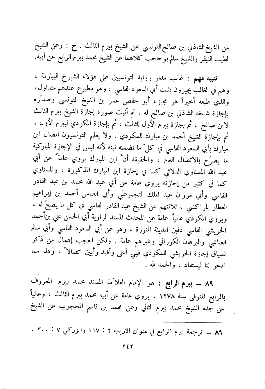89 - بيرم الرابع (1) : هو الإمام العلامة المسند محمد بيرم المعروف بالرابع المتوفى سنة 1278، يروي عامة عن أبيه محمد بيرم الثالث، وعالياً عن جده الشيخ محمد بيرم الثاني وعن محمد بن قاسم المحجوب عن الشيخ