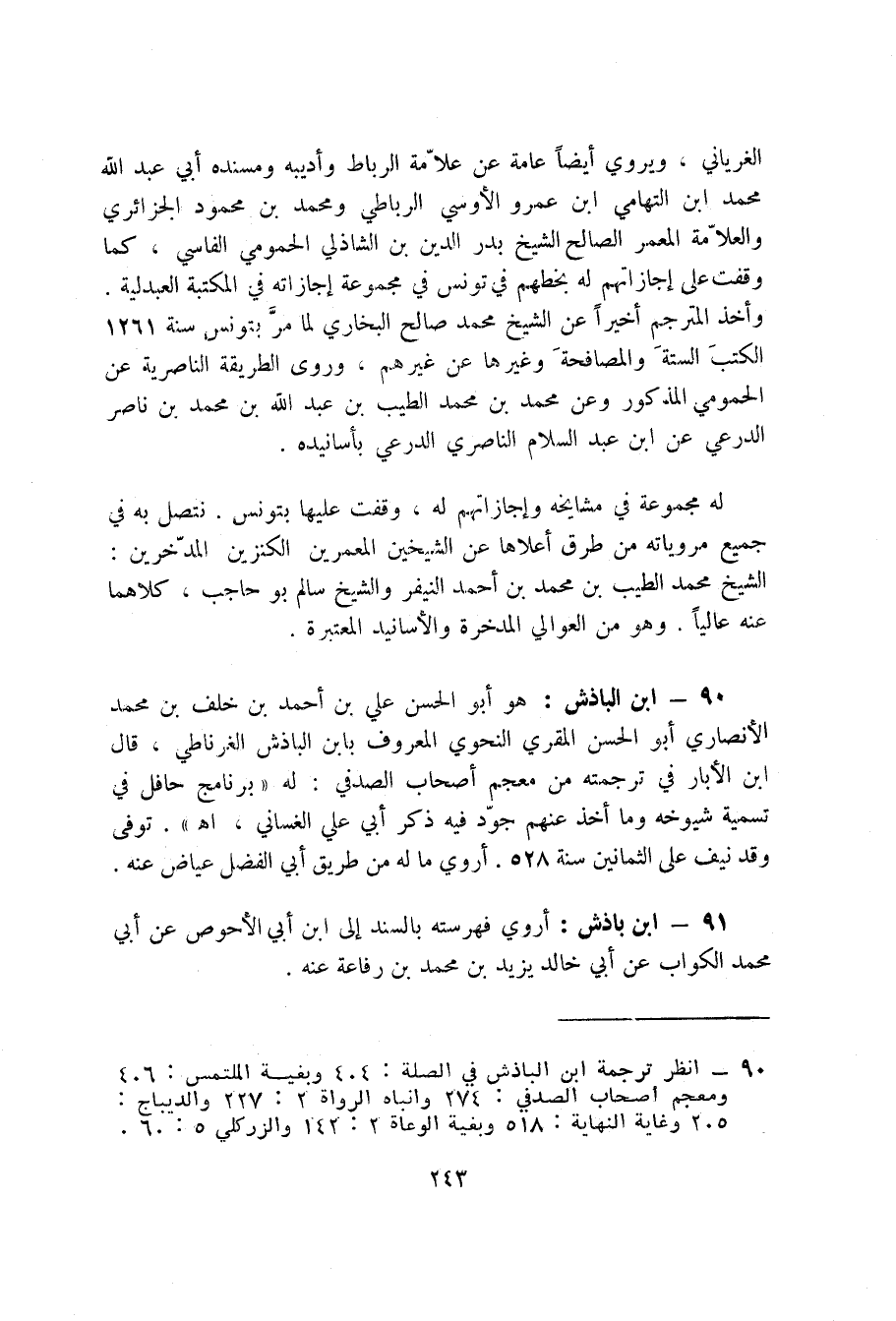 90 - ابن الباذش (1) : هو أبو الحسن عليّ بن أحمد بن خلف بن محمد الأنصاري أبو الحسن المقري النحوي المعروف بابن الباذش الغرناطي، قال ابن الأبار في ترجمته من معجم أصحاب الصدفي: له " برنامج حافل في تسمية شيوخه وما أخذ عنهم جود فيه ذكر أبي عليّ الغساني، اه ". توفى وقد نيف على الثمانين سنة 528. أروي ما له من طريق أبي الفضل عياض عنه.