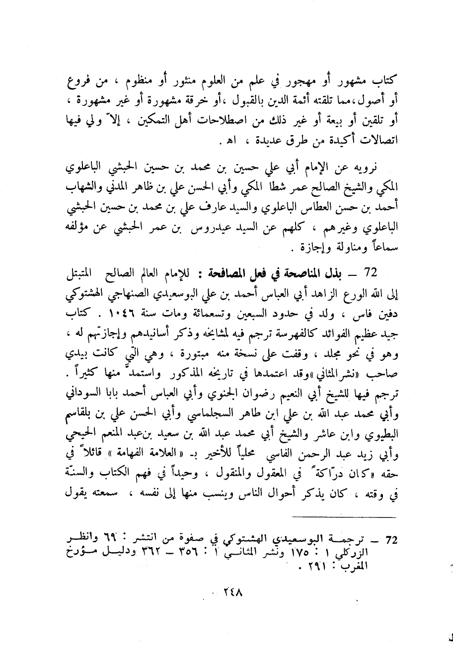 72 - بذل المناصحة في فعل المصافحة (1) : للإمام العالم الصالح المتبتل إلى الله الورع الزاهد أبي العباس أحمد بن عليّ البوسعيدي الصنهاجي الهشتوكي دفين فاس، ولد في حدود السبعين وتسعمائة ومات سنة 1046. كتاب جيد عظيم الفوائد كالفهرسة ترجم فيه لمشايخه وذكر أسانيدهم وإجازتهم له، وهو في نحو مجلد، وقفت على نسخة منه مبتورة، وهي التي كانت بيدي صاحب " نشر المثاني " وقد اعتمدها في تاريخه المذكور واستمد منها كثيراً. ترجم فيها للشيخ أبي النعيم رضوان الجنوي وأبي العباس أحمد بابا السوداني وأبي محمد عبد الله بن عليّ ابن ظاهر السجلماسي وأبي الحسن عليّ بن بلقاسم البطيوي وابن عاشر والشيخ أبي محمد عبد الله بن سعيد بن عبد المنعم الحيحي وأبي زيد عبد الرحمن الفاسي محلياً للأخير ب " العلامة الفهامة " قائلاً في حقه " كان دراكة في المعقول والمنقول، وحيداً في فهم الكتاب والسنة في وقته، كان يذكر أحوال الناس وينسب منها إلى نفسه، سمعته يقول