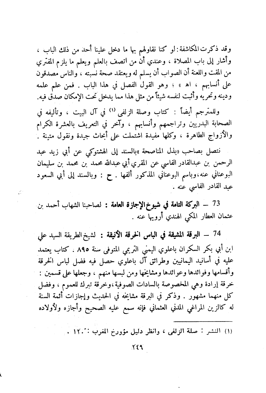وقد ذكرت المكاشفة: لو كنا نقاولهم بها ما دخل علينا أحد من ذلك الباب، وأشار إلى باب المصلاة، وعندي أن من اتصف بالعلم ويعلم ما يلزم المفتري من المقت واللعنة أن الصواب أن يسلم له ويعتقد صحة نسبته، والناس مصدقون على أنسابهم، اه ". وهو القول الفصل في هذا الباب. فمن علم علمه ودينه وتحريه وأثبت لنفسه شيئاً من مثل هذا مما يدخل تحت الإمكان صدق فيه. وللمترجم أيضاً: كتاب وصلة الزلفى (1) في آل البيت، وتأليفه في الصحابة البدريين وتراجمهم وأنسابهم، وآخر في التعريف بالعشرة الكرام والأزواج الطاهرة، وكلها مفيدة اشتملت على أبحاث جيدة ونقول متينة.