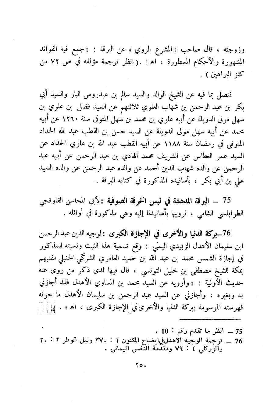 76 - بركة الدنيا والأخرى في الإجازة الكبرى (2) : لوجيه الدين عبد الرحمن ابن سليمان الأهدل الزبيدي اليمني: وقع تسمية هذا الثبت ونسبته للمذكور في إجازة الشمس محمد بن عبد الله بن حميد العامري الشركي الحنبلي مفتيهم بمكة للشيخ مصطفى بن خليل التونسي، قال فيها لدى ذكر من روى عنه حديث الأولية: " وأرويه عن السيد محمد بن المساوي الأهدل فقد أجازني به وبغيره، وأجازني عن السيد عبد الرحمن بن سليمان الأهدل ما حوته فهرسته الموسومة ببركة الدنيا والأخرى في الإجازة الكبرى، اه ".