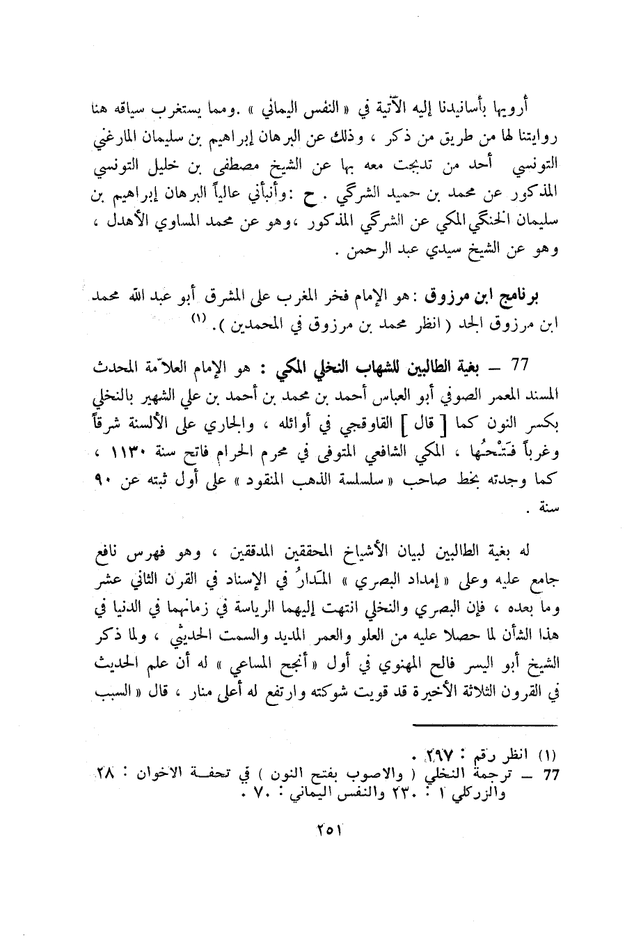 (2) اترجمة النخلي (والاصوب بفتح النون) في تحفة الاخوان: 28 والزركلي 1: 230 والنفس اليماني: 70.