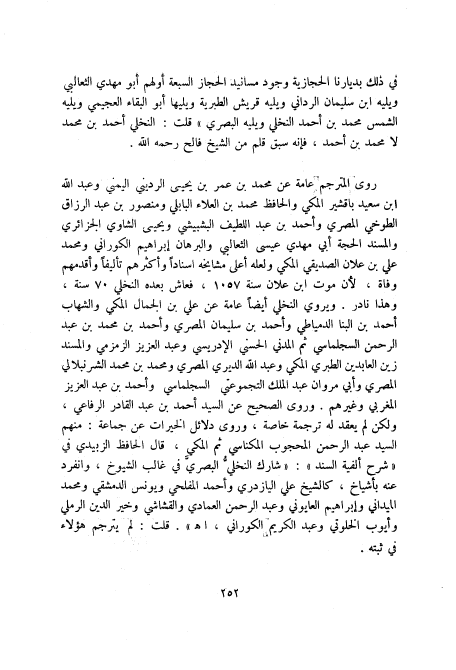في ذلك بديارنا الحجازية وجود مسانيد الحجاز السبعة أولهم أبو مهدي الثعالبي ويليه ابن سليمان الرداني ويليه قريش الطبرية ويليها أبو البقاء العجيمي ويليه الشمس محمد بن أحمد النخلي ويليه البصري " قلت: النخلي أحمد بن محمد لا محمد بن أحمد، فإنه سبق قلم من الشيخ فالح رحمه الله.