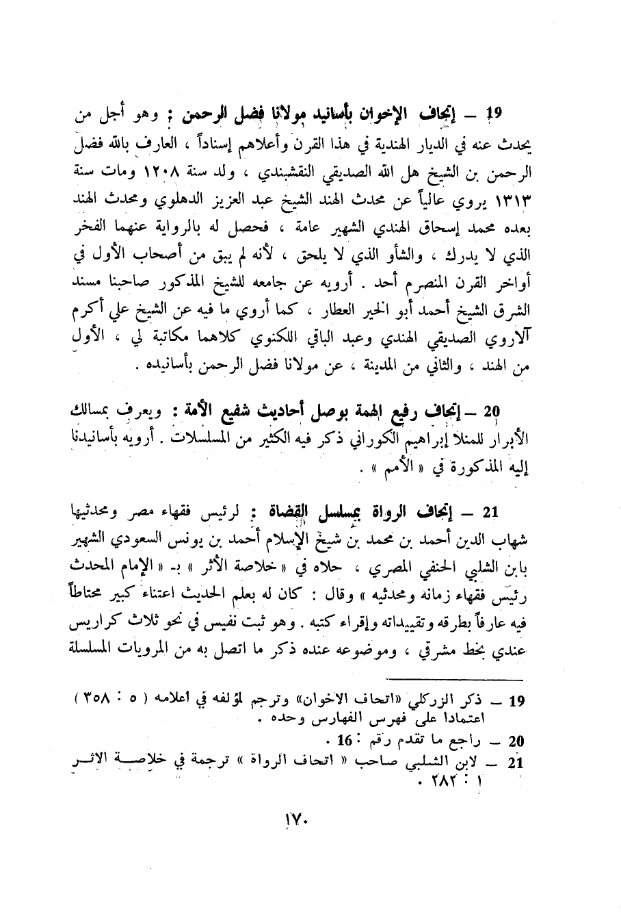 110 - تقي الدين ابن فهد المكي (1) : هو الإمام الحافظ الرحلة تقي الدين أبو الفضل محمد بن النجم محمد الشريف العلوي الشهير كسلفه بابن فهد المكي الشافعي، ولد سنة 787 بأصفون من بلاد مصر وانتقل به أبوه إلى مكة سنة 795، وسمع من البنوسي وابن صديق والزين المراغي وأبي اليمن الطبري وغيرهم ممن دب ودرج، ولقي باليمن الفيروزابادي، وأجاز له خلق كثير، وعرف العالي والنازل، وشارك في فنون الأثر، واجتمع له من الكتب مالم يجتمع لغيره من أهل بلده.