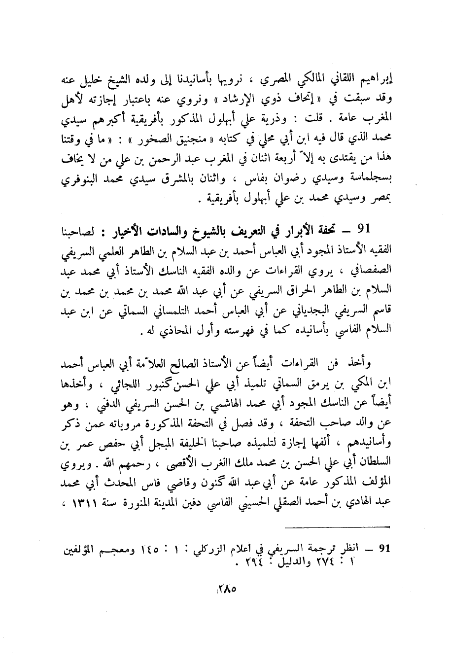 91 - تحفة الأبرار في التعريف بالشيوخ والسادات الأخيار (1) : لصاحبنا الفقيه الأستاذ المجود أبي العباس أحمد بن عبد السلام بن الطاهر العلمي السريفي الصفصافي، يروي القراءات عن والده الفقيه الناسك الأستاذ أبي محمد عبد السلام بن الطاهر الحراق السريفي عن أبي عبد الله محمد بن محمد بن محمد بن قاسم السريفي البجدياني عن أبي العباس أحمد التلمساني السماتي عن ابن عبد السلام الفاسي بأسانيده كما في فهرسته وأول المحاذي له.