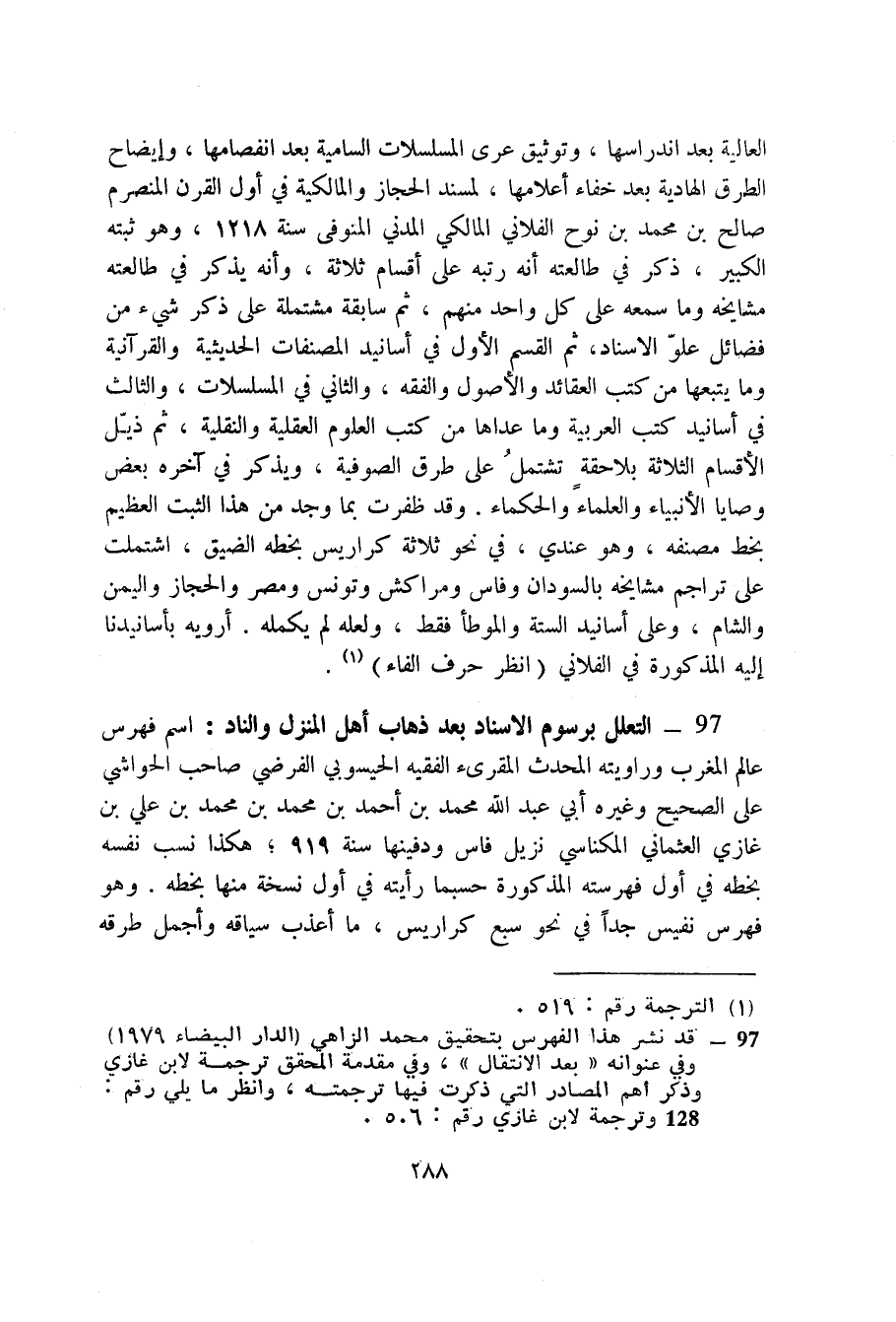 (2) قد نشر هذا الفهرس بتحقيق محمد الزاهي (الدار البيضاء 1979) وفي عنوانه " بعد الانتقال "، وفي مقدمة المحقق ترجمة لابن غازي وذكر أهم المصادر التي ذكرت فيها ترجمته، وانظر ما يلي رقم: 128 وترجمة لابن غازي رقم: 506.