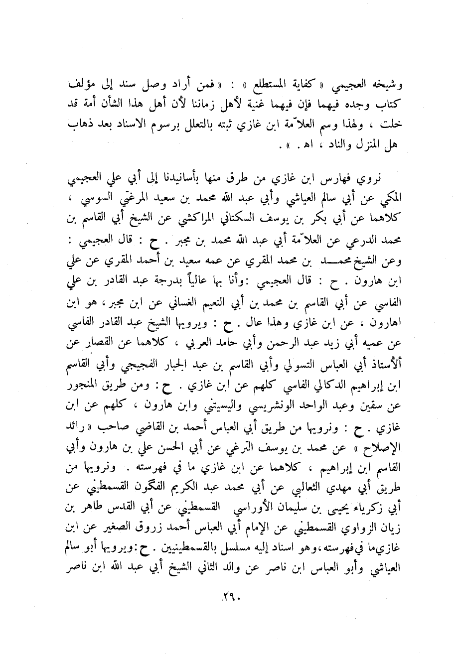 وشيخه العجيمي " كفاية المستطلع ": " فمن أراد وصل سند إلى مؤلف كتاب وجده فيهما فإن فيهما غنية لأهل زماننا لأن أهل هذا الشأن أمة قد خلت، ولهذا وسم العلامة ابن غازي ثبته بالتعلل برسوم الاسناد بعد ذهاب أهل المنزل والناد، اه. ".