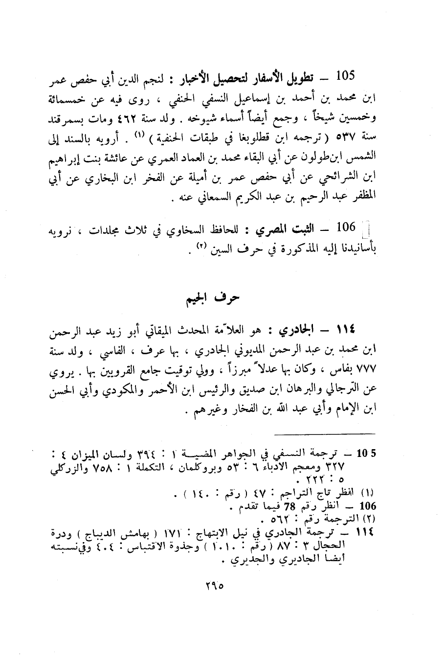 105 - تطويل الأسفار لتحصيل الأخبار (1) : لنجم الدين أبي حفص عمر ابن محمد بن أحمد بن إسماعيل النسفي الحنفي، روى فيه عن خمسمائة وخمسين شيخاً، وجمع أيضاً أسماء شيوخه. ولد سنة 462 ومات بسمر قند سنة 537 (ترجمه ابن قطلوبغا في طبقات الحنفية) (2) . أرويه بالسند إلى الشمس ابن طولون عن أبي البقاء محمد بن العماد العمري عن عائشة بنت إبراهيم ابن الشرائحي عن أبي حفص عمر بن أميلة عن الفخر ابن البخاري عن أبي المظفر عبد الرحيم بن عبد الكريم السمعاني عنه.
