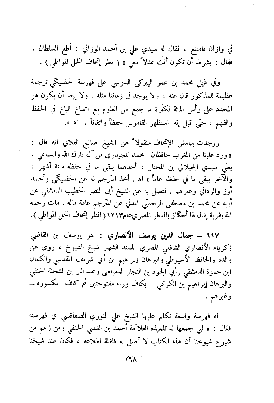 117 - جمال الدين يوسف الأنصاري: هو يوسف بن القاضي زكرياء الأنصاري الشافعي المصري المسند الشهير شيخ الشيوخ، روى عن والده والحافظ الأسيوطي والبرهان إبراهيم بن أبي شريف المقدسي والكمال ابن حمزة الدمشقي وأبي الجود بن النجار الدمياطي وعبد البر بن الشحنة الحنفي والبرهان إبراهيم بن الكركي بكاف وراء مفتوحتين ثم كاف مكسورة وغيرهم.